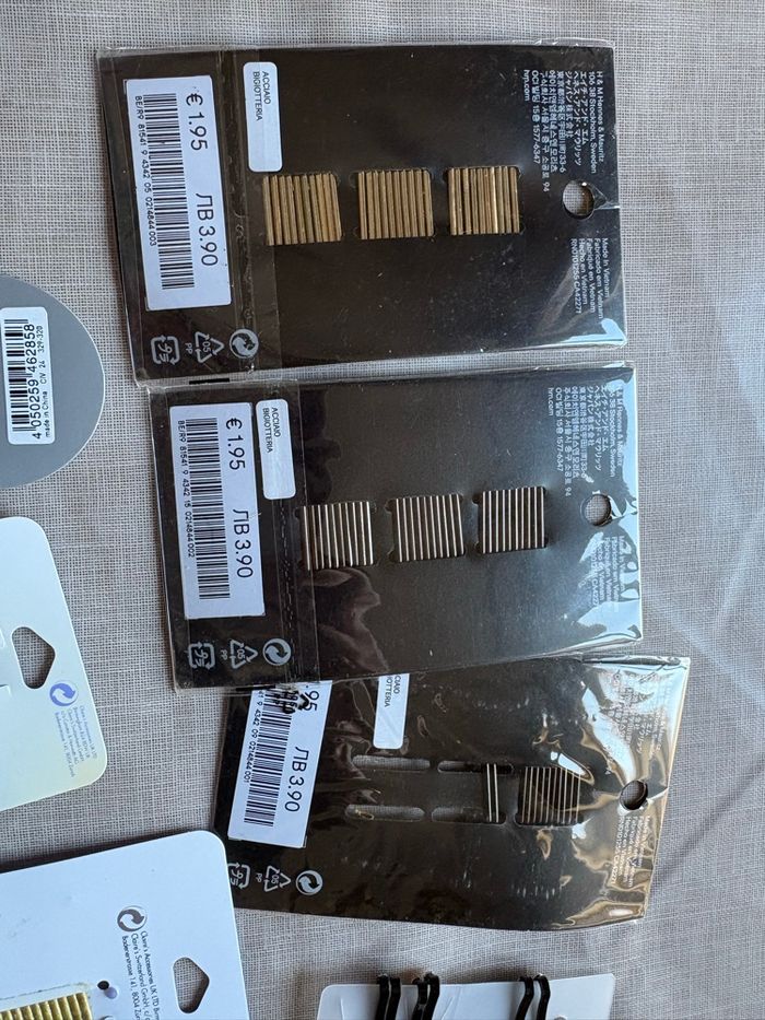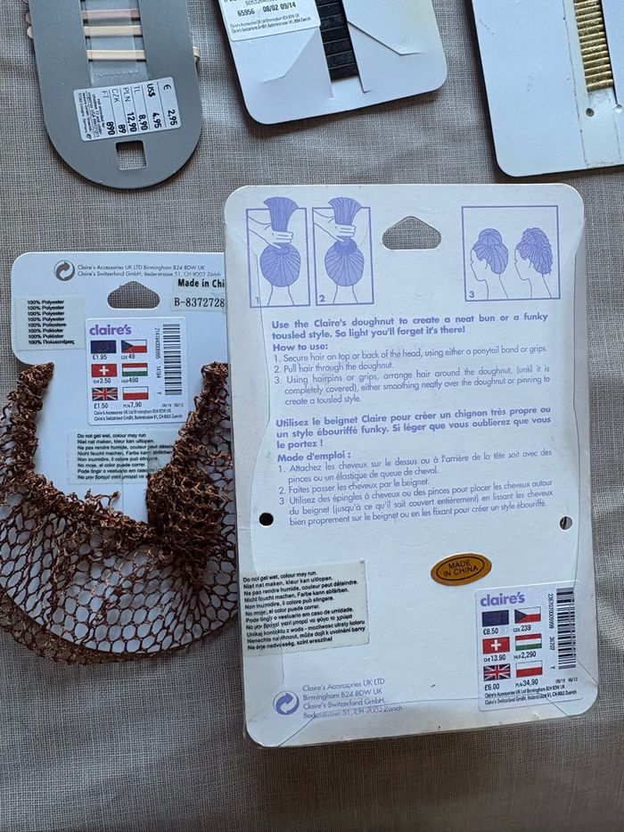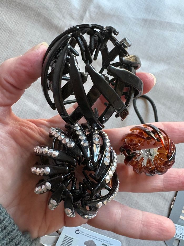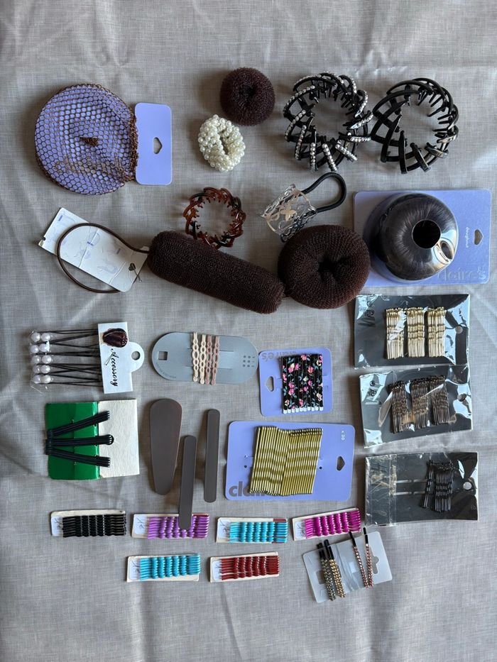 Gros lot d’Arctique, pour attacher les cheveux ou faire de l’embellissement, comme des barrettes ou des doughnuts pour faire des chignons… Beaucoup d’articles neufs toujours dans l’emballage qui viennent de chez Claire et HDMI En tout il y en a pour 36 € juste pour les articles neufs emballés avec le prix Ceux qui n’ont pas d’emballage eux sont aussi neufs jamais utilisé