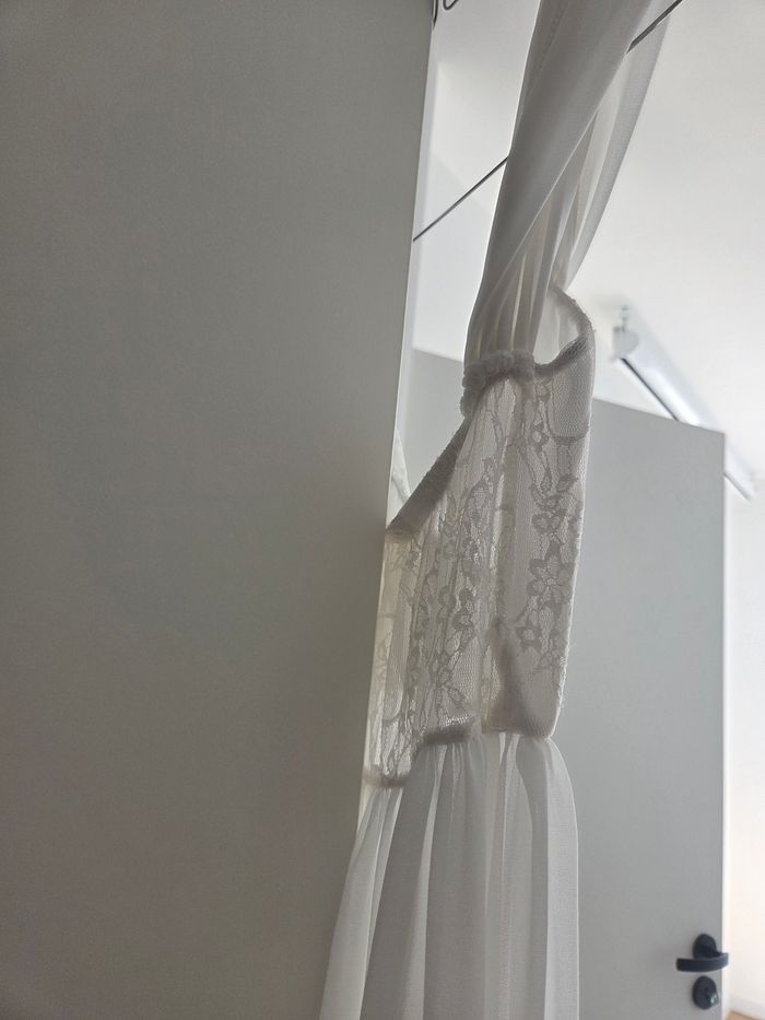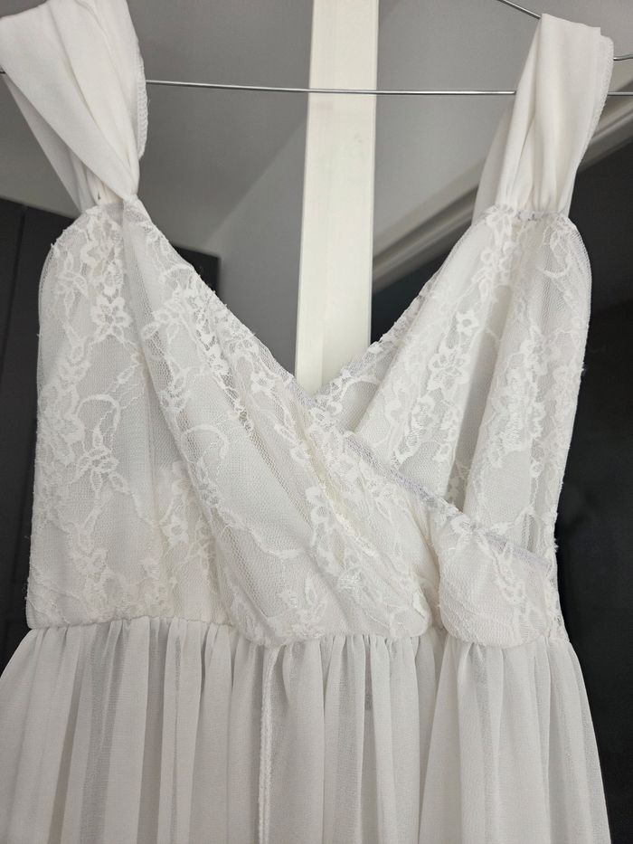 Robe pouvant servir pour un shooting grossesse. Blanche, voile long, transparent et ouvert. Le tissu avant au niveau de la poitrine n'est pas transparent mais l'arrière oui. Servie 1 fois.