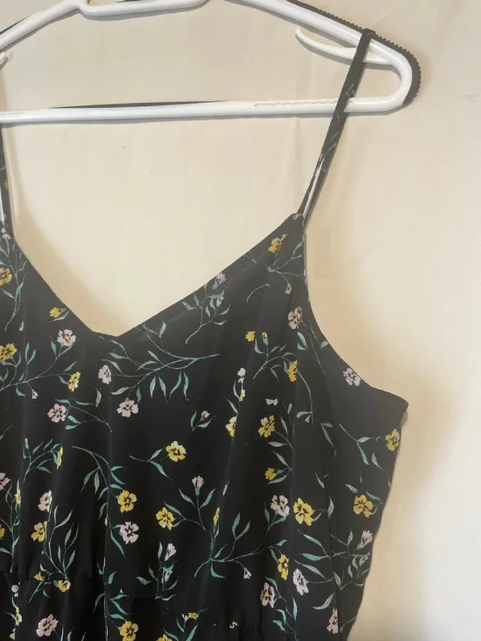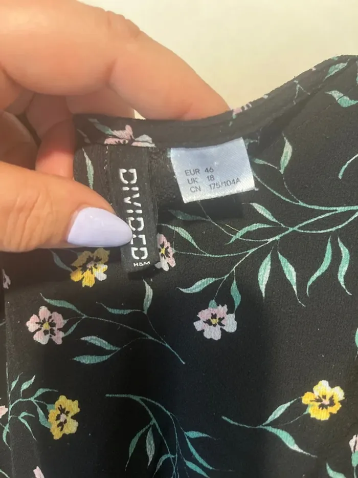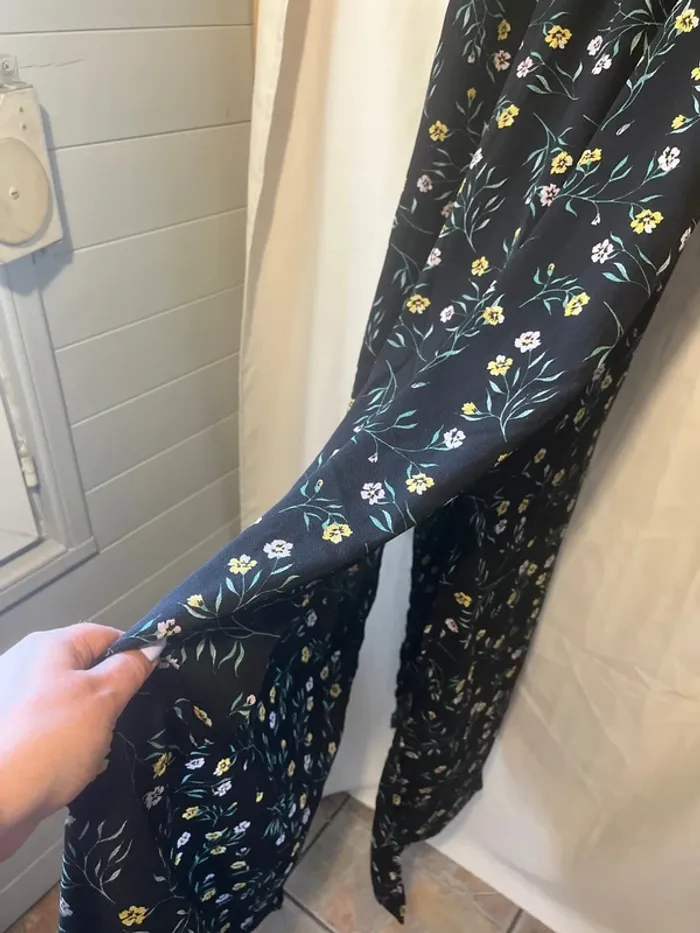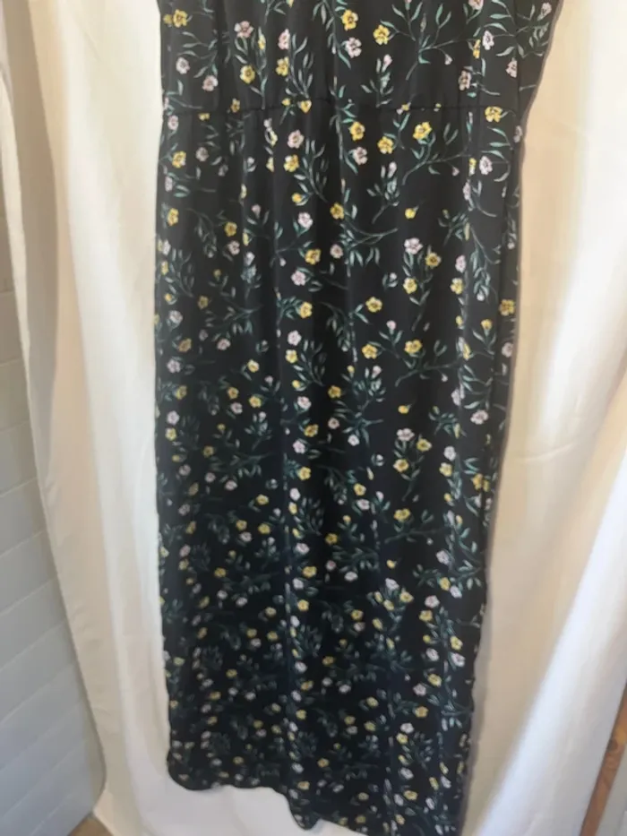 Robe longue Noire imprimée fleurs Taille 46 Ouverte sur les côtés Aisselle à aisselle 53 cm, Longueur 148 cm
