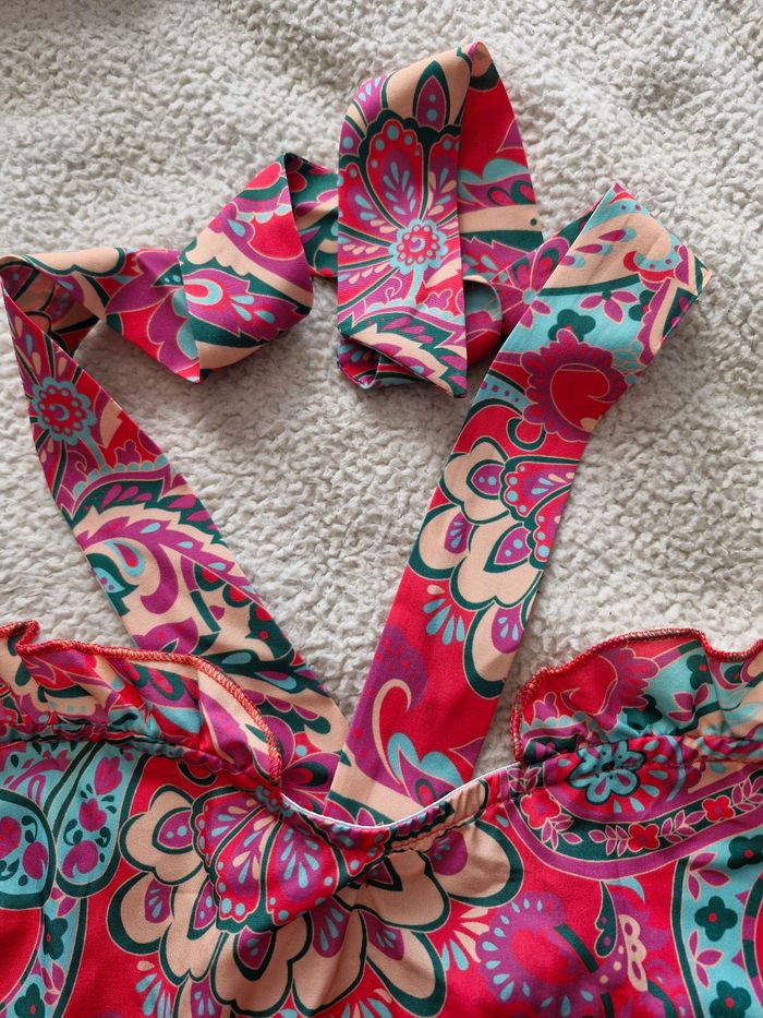 Top bretelles nouées vert fleurs roses