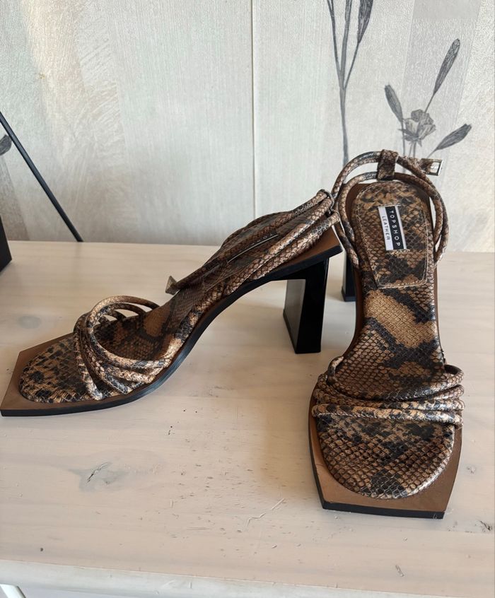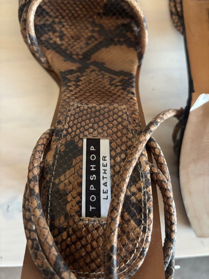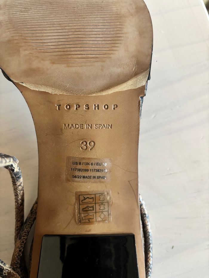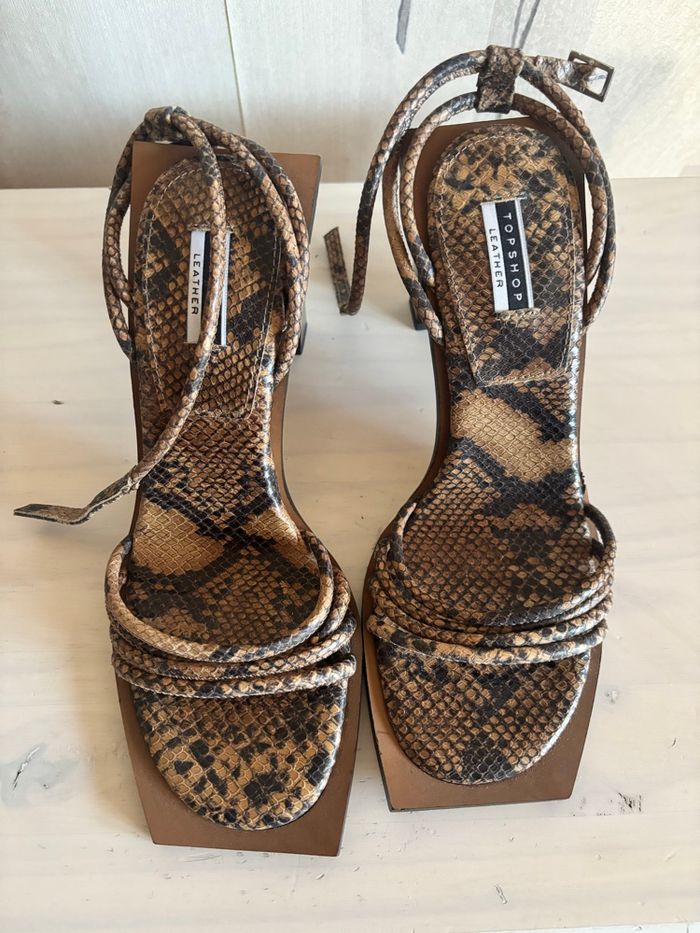 Magnifiques sandales à talons Topshop avec effet python 🐍 Taille 39. Jamais portées, seulement essayées → état neuf ✨ Fermeture avec bride à la cheville pour un bon maintien. ⚠️petite imperfection ‼️voir dernière photo