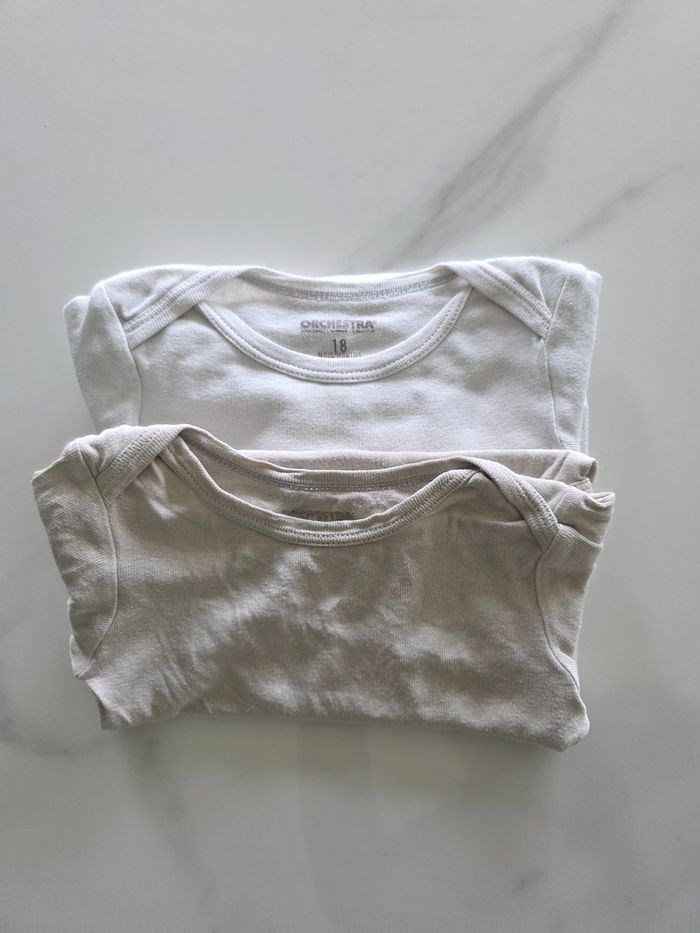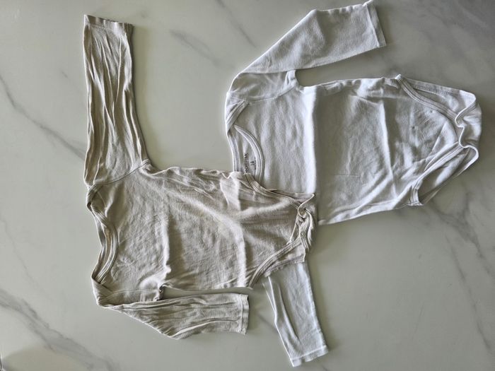 Lot de 2 body manche longue taille 18 mois de chez orchestra. ✨️ le beige comprend 1 tache devant ✨️ le blanc une micro tache sur le bas à l'arrière ✨️ Idéal pour l'été pour que l'enfant puisse jouer dehors, ou trainer en bodies ou sous une tenue. 📦 Envoie rapide 🚭 Maison non fumeur et sans animaux