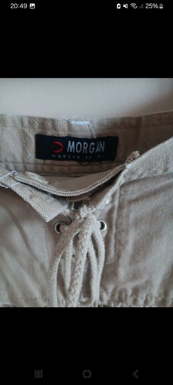 Jupe courte évasée qui arrive au dessus du genou, de couleur beige, avec un nœud et 2 poches devant. Possibilité de mettre une ceinture. Marque Morgan Taille S Jamais porté, juste lavée. Neuve.