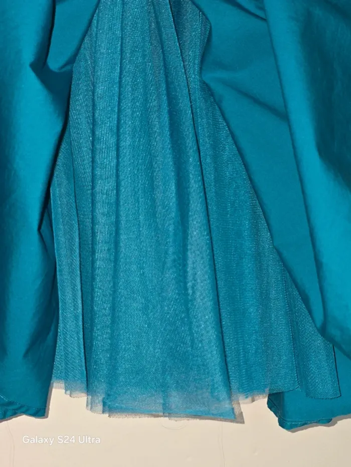 Robe courte colori bleu canard. Haut entièrement élastique donc s'adapte jusqu'à la taille 44 facilement. Petit jupon en tulle non rigide. Tres mignonne