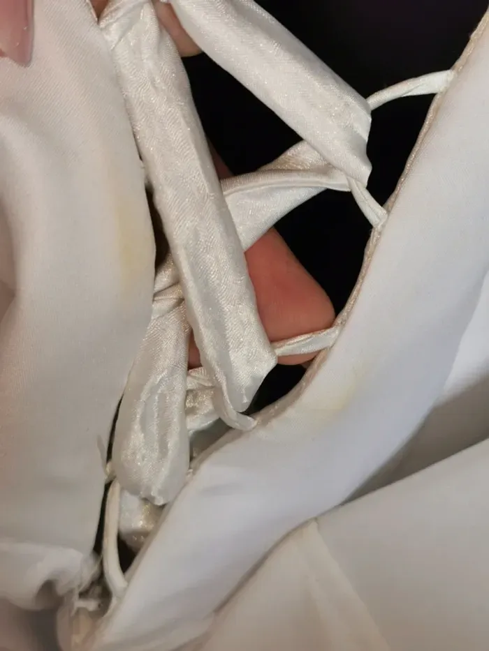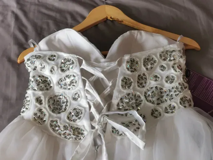 Robe acheté en déstockage mais que je n'aie finalement pas portée car ne va pas du tout à ma silhouette. Préformé a la poitrine. Dos à laçage, mais le ruban fourni est absolument très moche, à changer pour un effet plus waouh. Sans bretelles. Taille 38 mais convient pour un 40 je pense. Je fais 1m59, elle m'arrive au dessus du genou. ATTENTION !!! voir avant dernière photo, il y a une trace de ce que je pense être du fond de teint dans l'intérieur du bustier (y était déjà quand je l'aie acheté)