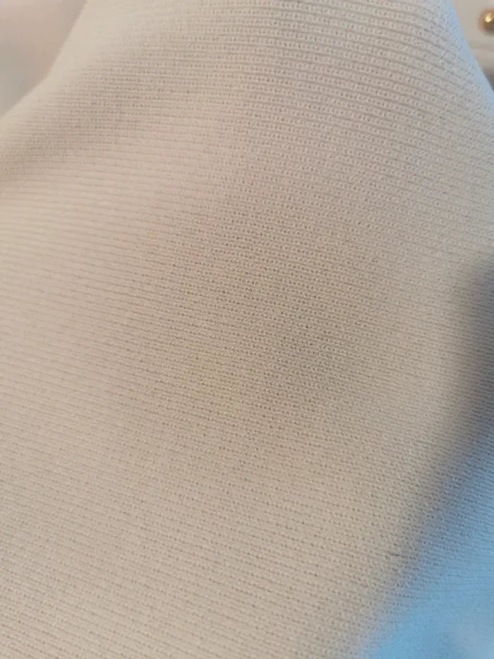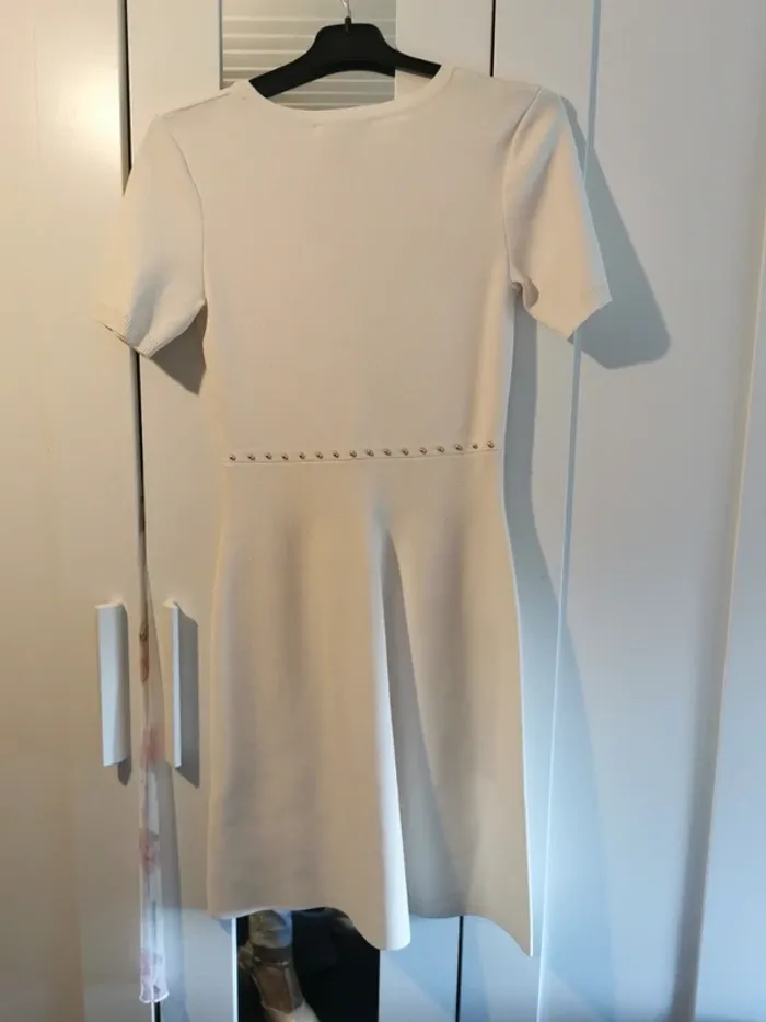 Superbe robe blanche en tissus lourd élastique décoré de clous dorés. C'est un 38 mais je trouve qu'elle taille petit, peut être à cause du tissus. Conviendrait parfaitement à un 36 ou les 38 qui aiment les robes moulantes. Achat coup de cœur. Jamais porté (ne va pas à ma morphologie en X) Tres chic