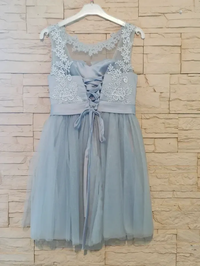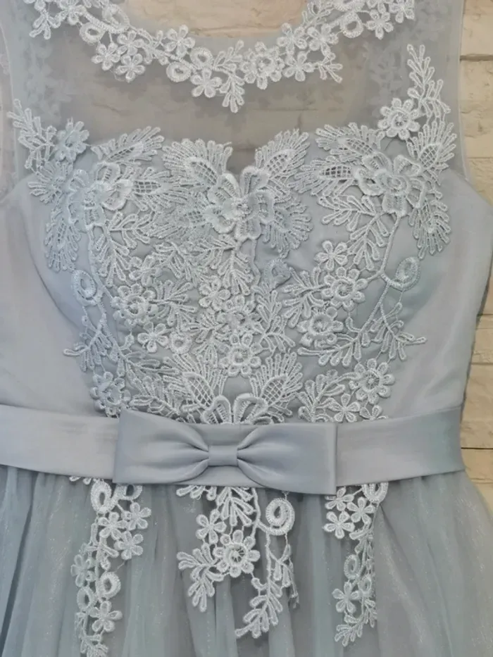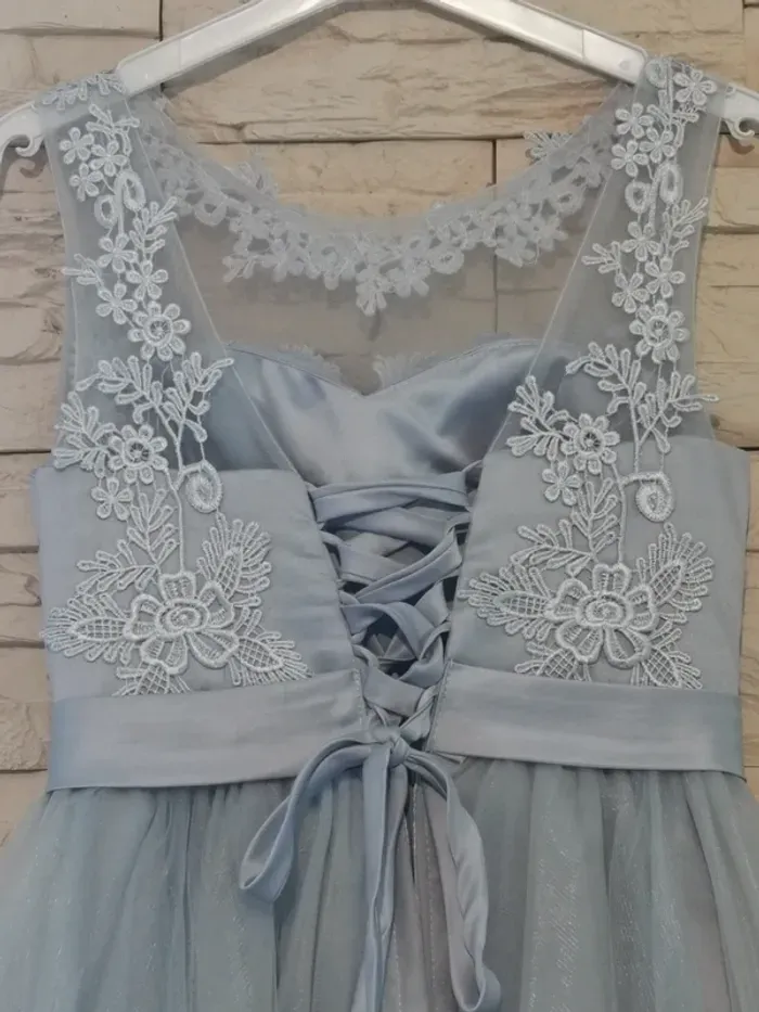 Mignonne petite robe de cocktail taille L de couleur gris perle avec laçage dans le dos. Tombé au genoux Tulle et appliques brodé. Super état, porté 1x. Taille L (petit 40, plutôt 38)