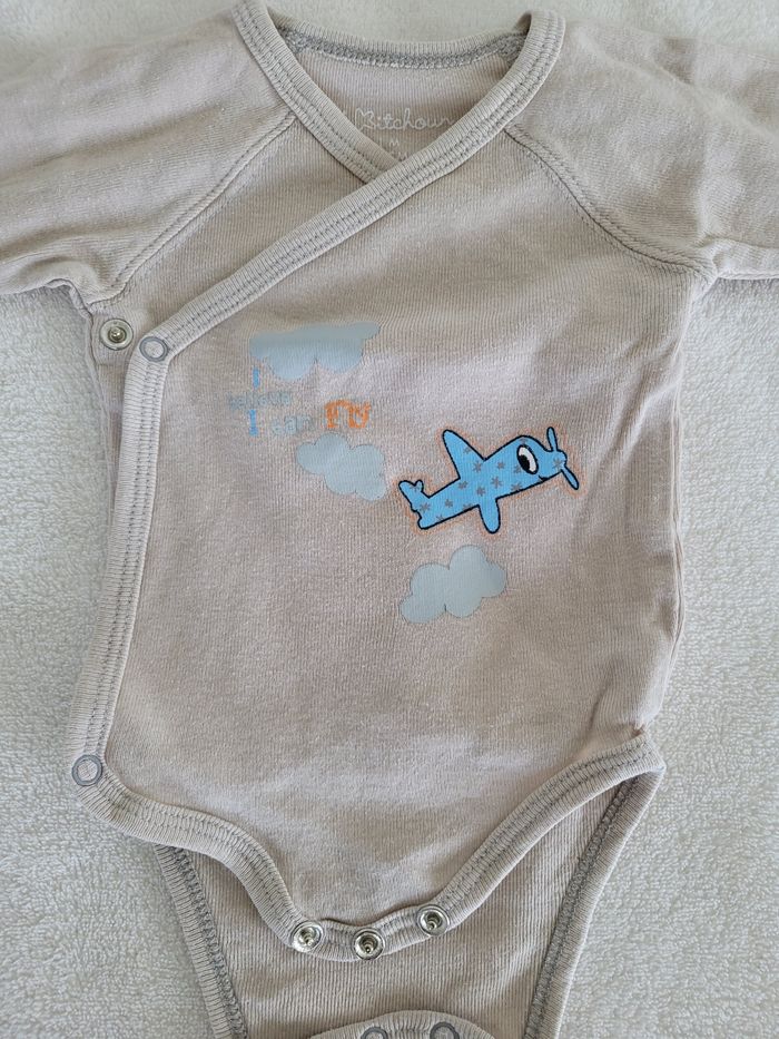 Lot de 2 bodies manches longues Ouverture par boutons pression sur le devant - 1 body marron avec un avion jaune - 1 body marron clair avec un avion bleu Les dessins sont un peu usés