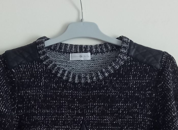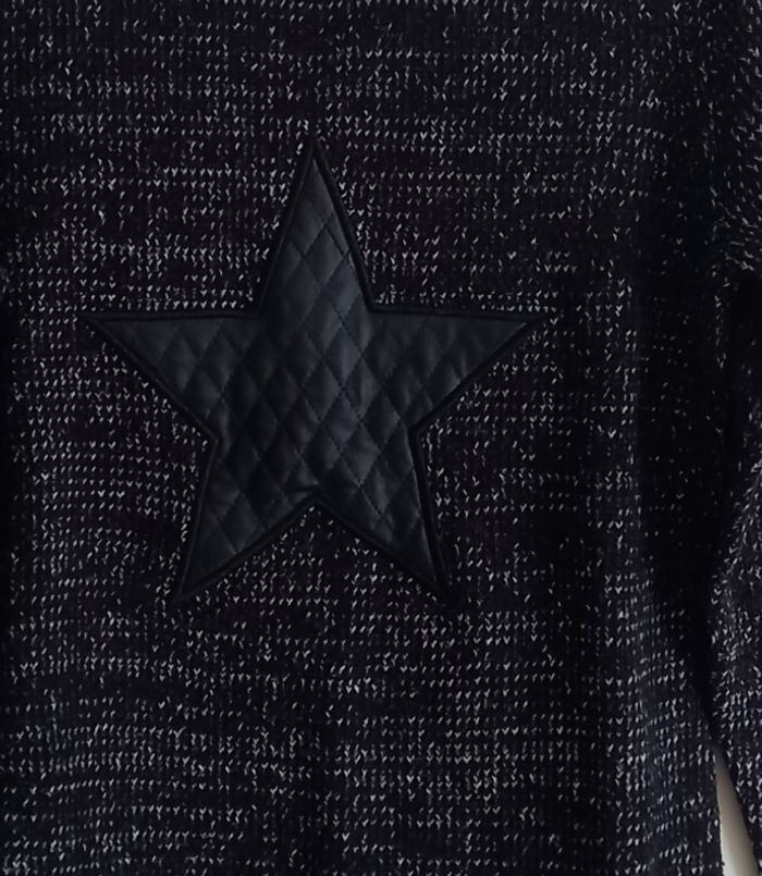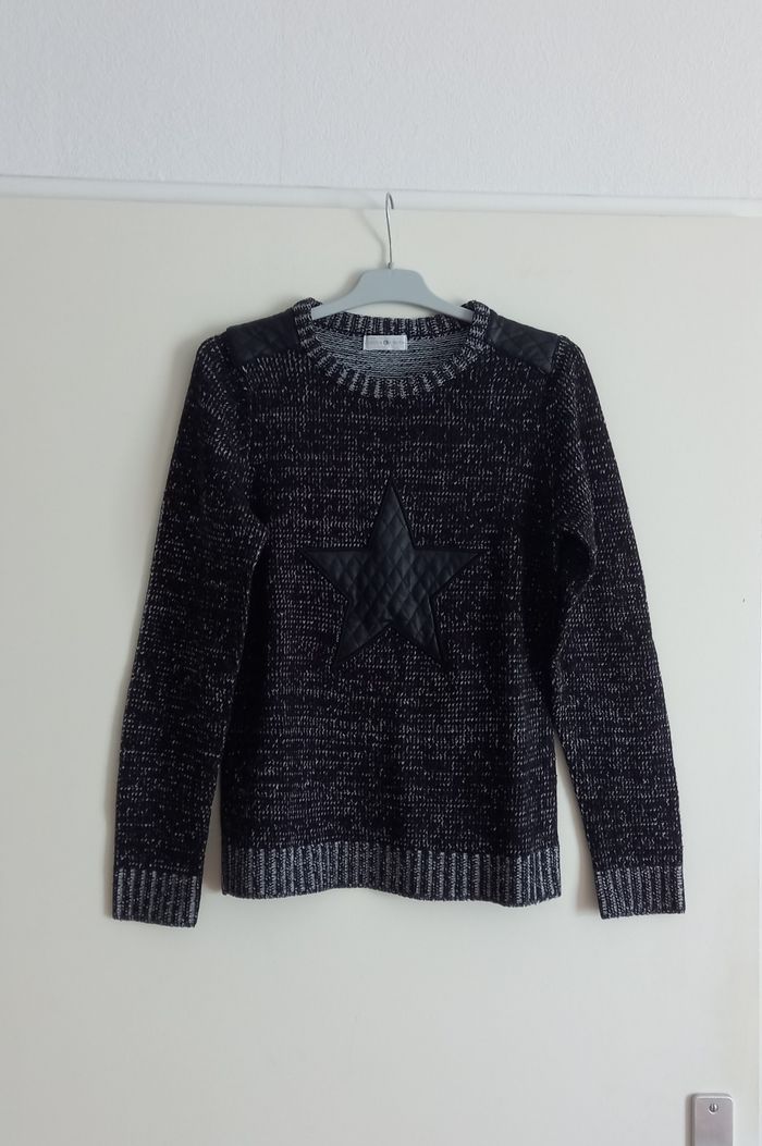 Pull de couleurs noir et blanc, de marque Cache Cache. Épaules, coudes et étoile en simili cuir. TAILLE 14 ANS. Pull de qualité.