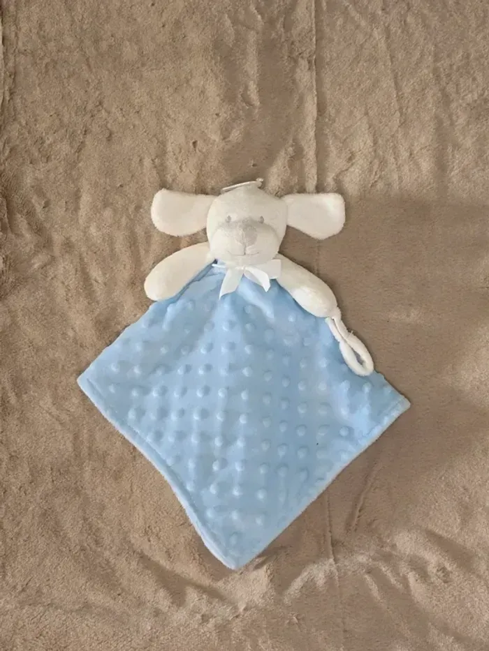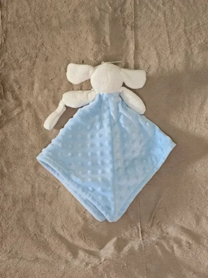 Doudou lapin avec un carré bleu clair. Attache tototte inclue. Tout neuf liquidation stock créa prénom brodé, police et coloris au choix +8€, me contacter (broderie propre sans fil sur l'envers)