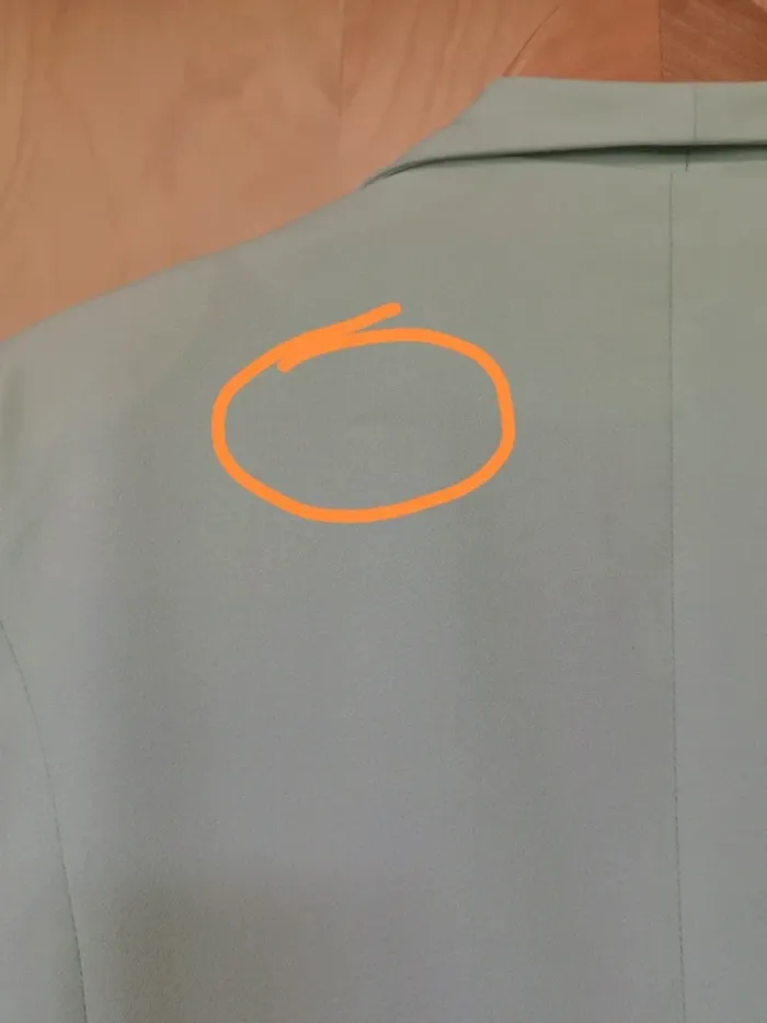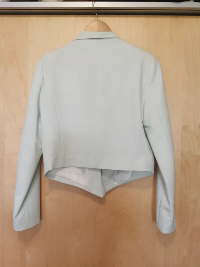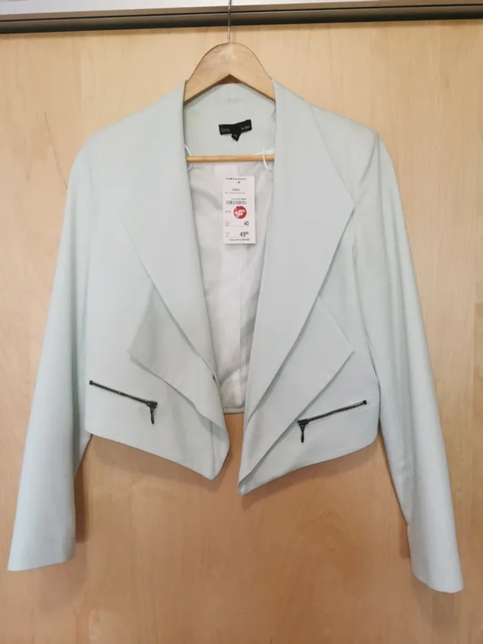 Joli blazer coupe asymétrique. Pas de fermeture Ca ne se voit pas bien en photo mais j'insiste sur le fait qu'il est bleu clair ou turquoise et non blanc. Petite tâche dans le dos voir dernière photo (peut-être juste un peu de poussière). Jamais porté, étiquette encore dessus