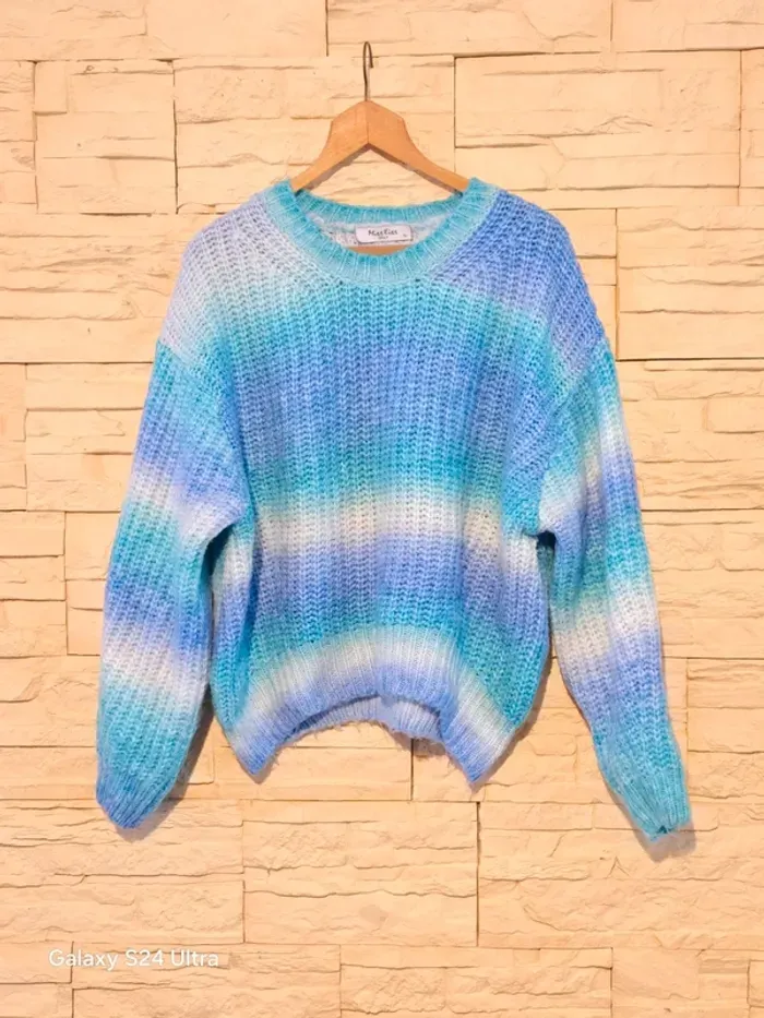 Pull large mais court (arrive à la taille). Dégradé de bleu. Chaud