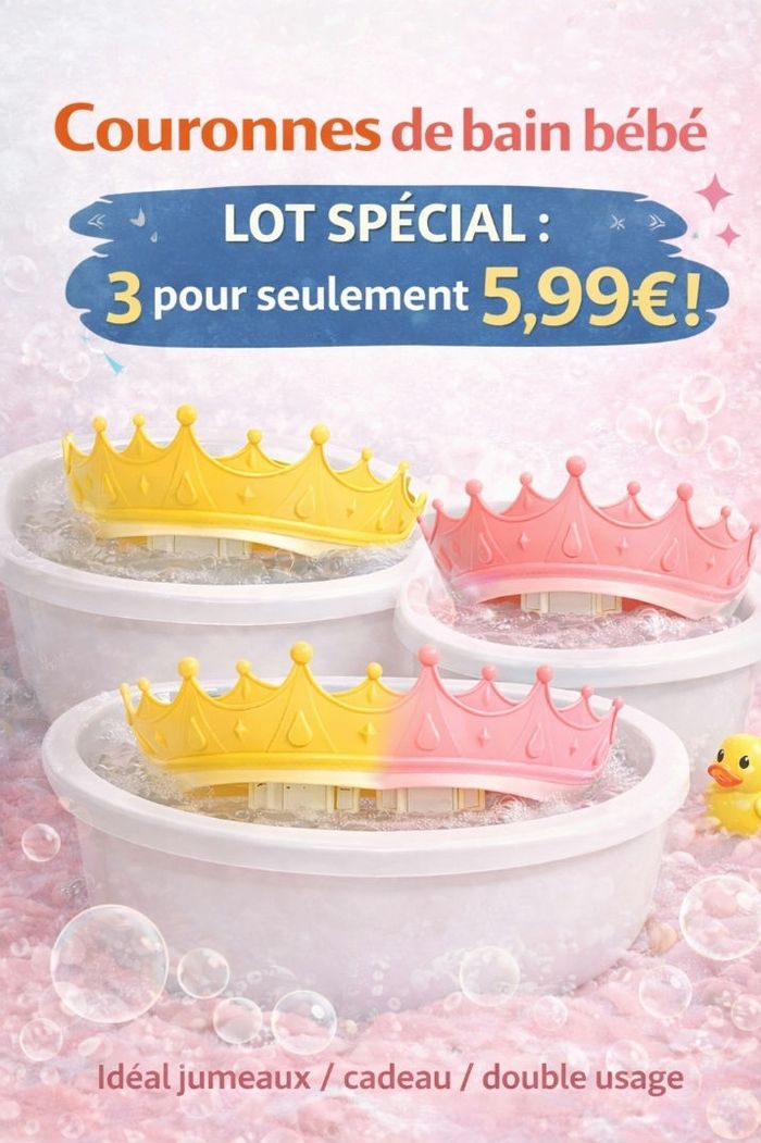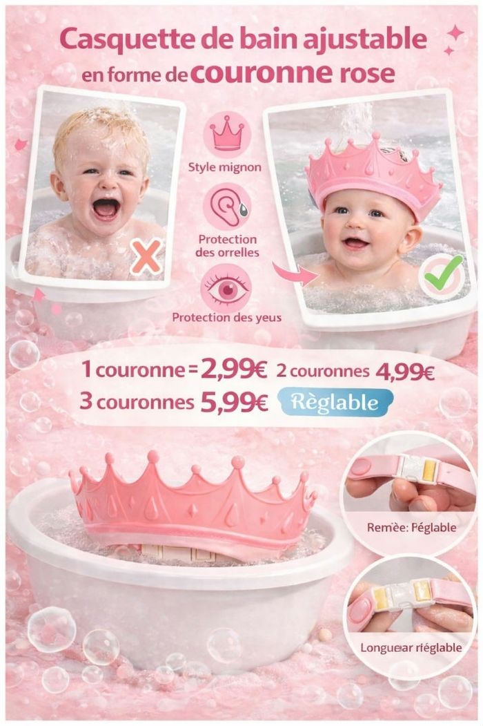 🟡👶 Casquette de bain bébé en forme de couronne 👑 – STOP aux pleurs ! 2,99€ seulement ! ✨ Fini le shampoing dans les yeux ! Cette adorable couronne de bain réglable protège les yeux 👀 et les oreilles 👂 de bébé pendant le bain 🛁 👉 Résultat : bébé rigole au lieu de pleurer 😄 ✅ Les + du produit : 👑 Forme couronne trop mignonne 💦 Protège du shampoing et de l’eau 👂 Protège les oreilles 👀 Évite l’eau dans les yeux 🔄 Réglable (s’adapte à la tête de bébé) 🧸 Matière souple et confortable 🛁 Idéal pour bain, douche ou shampoing 🎨 Coloris disponibles : 🟡 Jaune 🌸 Rose 💰 PRIX IMBATTABLE : 🔥 Vendu +20€ ailleurs 👉 Chez moi : 1 couronne = 2,99€ 2 couronnes = 4,99€ 3 couronnes = 5,99€ 💡 Parfait pour jumeaux, cadeau ou avoir une d’avance ! 📦 Infos pratiques : ✔️ Neuf 🚚 Envoi rapide 📍 Remise possible selon dispo 💬 Pourquoi acheter ? ➡️ Produit très demandé ➡️ Prix mini 💸 ➡️ Idéal pour parents malins