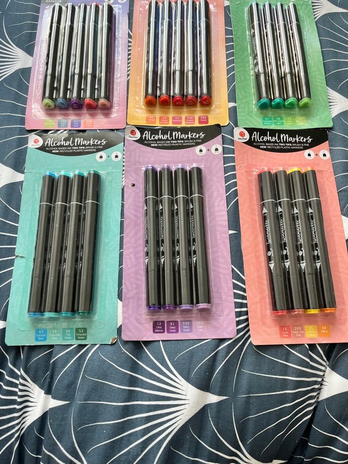 Bonjour ! Je vends ce superbe lot de marqueurs à alcool de la marque Twinmarkers. Ils sont parfaits pour le dessin, le coloriage de précision (mandala, illustration) ou le bullet journal. • État : Neufs, jamais déballés (sous blister). • Caractéristiques : Double pointe (une pointe fine et une pointe pinceau/brush). Encre à base d'alcool pour des dégradés parfaits. Corps en plastique recyclé. • Contenu : 9 packs thématiques Thèmes inclus : • Spring (Printemps) • Skin Tones (Tons chair) • Neon (Néon) • Blossom (Fleurs) • Sundown (Coucher de soleil) • Et plusieurs assortiments de dégradés (Bleus, Verts, Violets, Jaunes/Oranges). Ligne du haut (de gauche à droite) • Pack "Spring" (Bleu clair) : 74, 63, 144, 172, 49 • Pack "Skin Tones" (Beige) : 132, 133, 116, 102, 91 • Pack "Neon" (Bleu/Rose) : 04, 24, 31, 143, 67 Ligne du milieu (de gauche à droite) • Pack "Blossom" (Rose) : 166, 190, 81, 208, 139 • Pack "Sundown" (Orange) : 23, 22, 15, 210, 201 • Pack "Verts" (Vert) : 57, 58, 59, 161 Ligne du bas (de gauche à droite) • Pack "Bleus" (Turquoise) : 63, 68, 60, 53 • Pack "Violets" (Violet) : 73, 81, 148, 153 • Pack "Jaunes/Oranges" (Corail) : 16, 209, 35, 34
