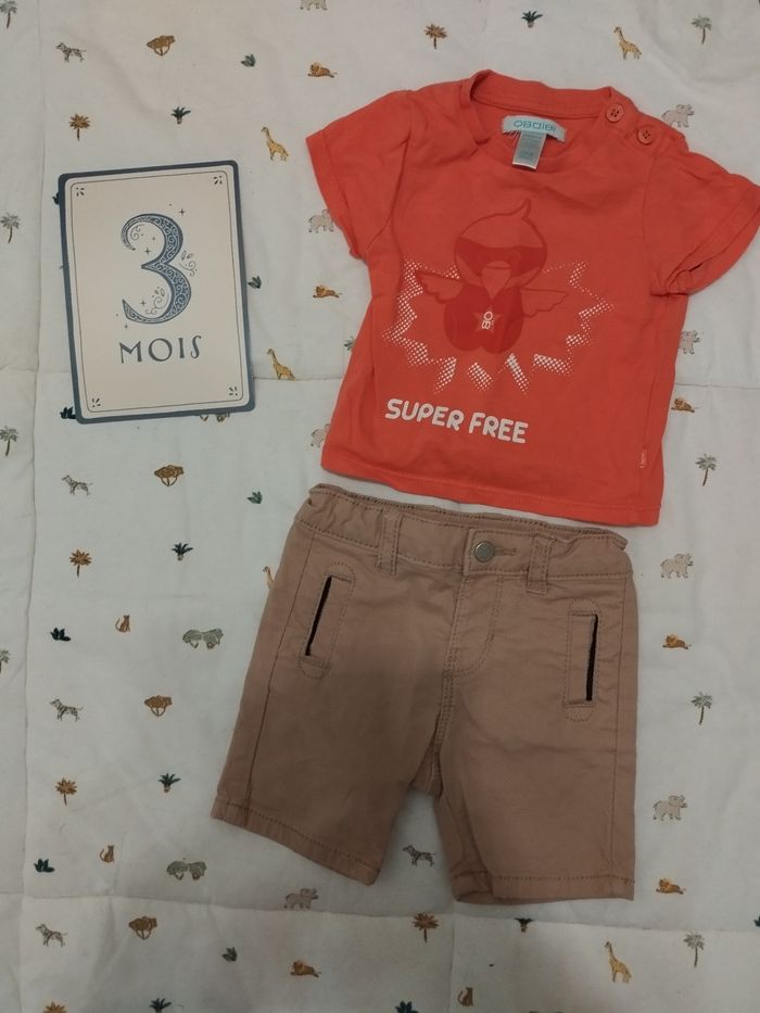 Ensemble composé d'un t-shirt Orange et d'un bermuda beige Obaibi En très bon état 3 mois