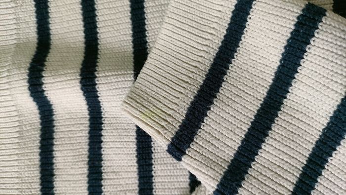 Pull rayé marin taille 24 mois. Il y a juste une petite tâche sur le dos d'une des manches sinon en très bon état.
