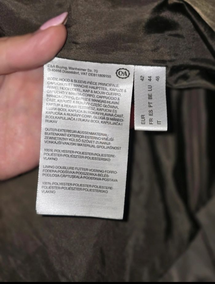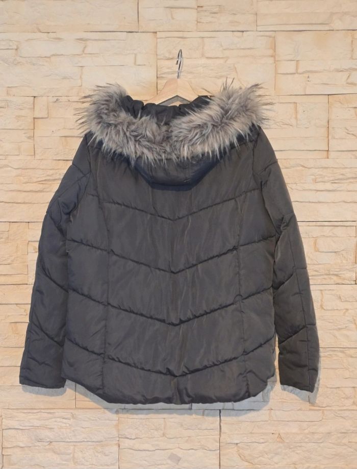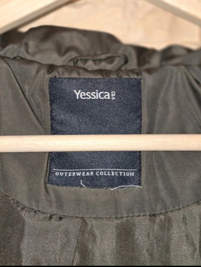 Doudoune de couleur kaki avec capuchon et fausse fourrure non amovible. Assymetrique dans le dos (couvre les fesses). Très bon état. Taille 44 Marque Yessica (C&A)