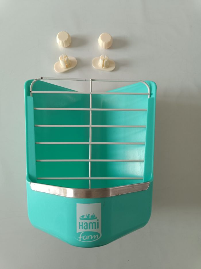 2 en 1 : fait mangeoire et râtelier. Se fixe à l'intérieur sur les grilles de la cage ou cavy cage. Pour rongeurs. Idéal pour foin / granulés. Hauteur : 23 cm. Taille de la mangeoire : 15 cm x 15 cm. Usure d'utilisation. Peinture écaillée sur la grille. #melody45340animaux