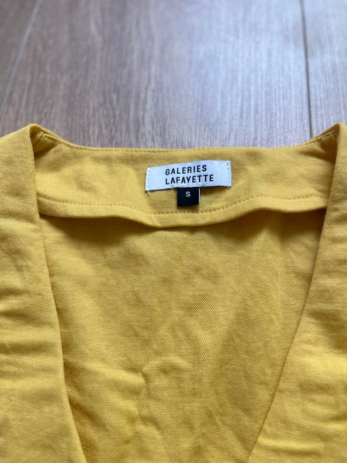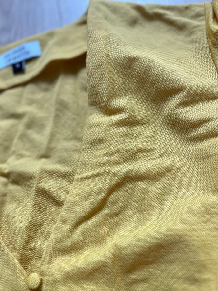 Bonjour, Belle robe courte d’été , avec petit volant en bas. Manches un peu volante, coupe cintré à la taille et part en trapèze ensuite. En parfait état, hormis un petit défaut peu visible au niveau du col. Marque galerie la Fayette Taille S