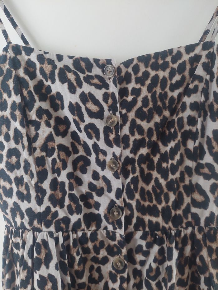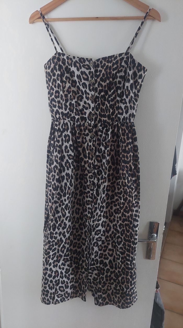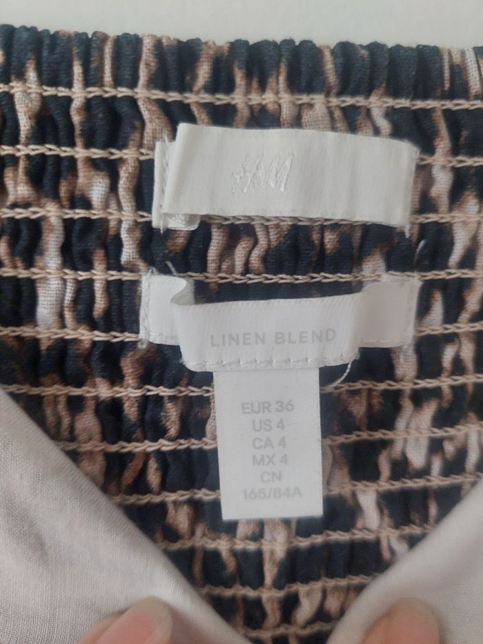 Robe H&M en lin imprimé léopard, fermeture avec boutons, doublée, dos smocké, longueur genou Taille 36