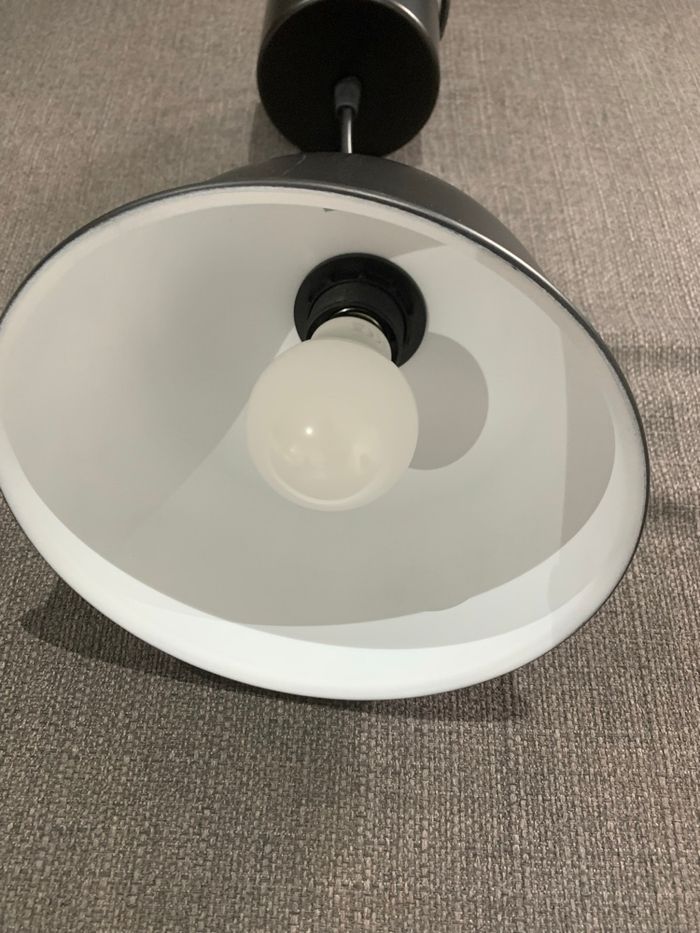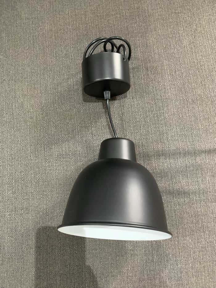 Lampe suspendue noir mat intérieur blanc Vendu avec ampoule Longueur du câble réglable jusqu’à 126 cm Largeur lampe 18,5 cm Dimension bouchon 12 cm En état neuf Juste une petite gratte sur un côté ( voir photo) d’où le prix très bas Maison non fumeur