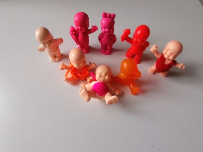 figurine lot de 8 babies vintage environ 4 à 5 cm en couleur, avec leur vêtement feutrine, chair et translucide vendus comme sur les photos peuvent présenter des traces du temps d'autres babies à voir dans mon dressing