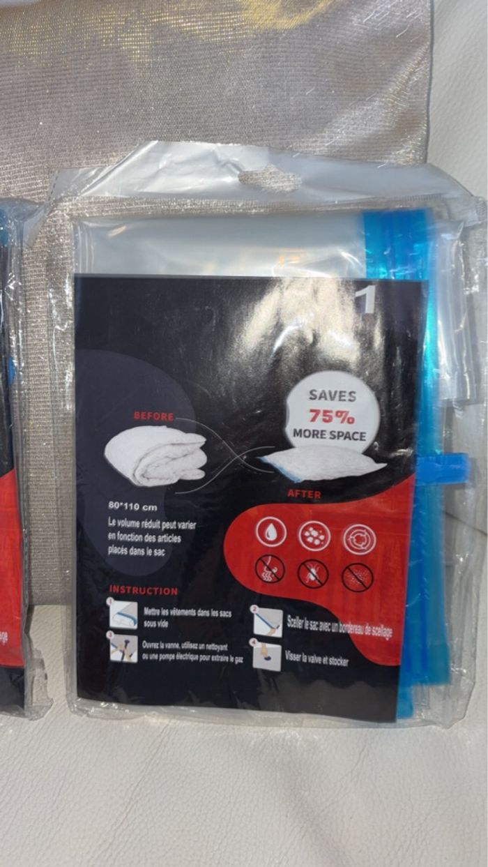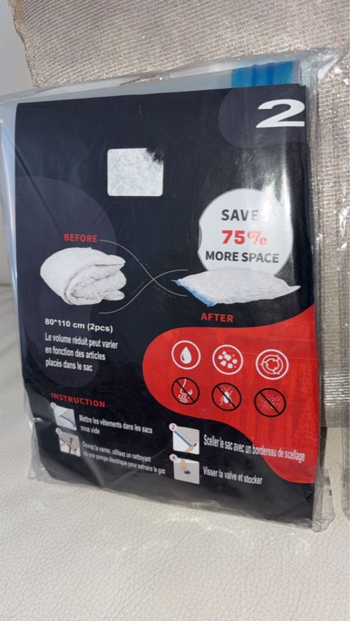 > Je vends ce **lot de 2 sacs de rangement sous vide (format XL)** acheté il y a **quelques mois**. > * **Pourquoi je m'en sépare :** Je fais un grand tri dans mes placards et j'en avais acheté en surplus, je n'en ai finalement pas l'utilité. > * **État :** Neufs, jamais déballés (encore sous plastique d'origine). Parfait état de fonctionnement pour gagner jusqu'à 75% de place. > * **Coupe/Taille :** Dimensions généreuses de 80 x 110 cm, idéal pour les couettes, oreillers ou gros manteaux d'hiver.
