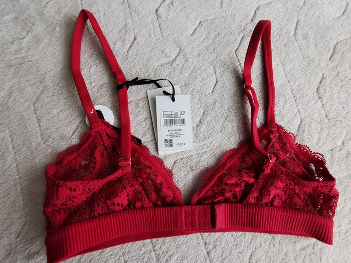 Vends soutien gorge rouge-bordeaux, sans armatures. Acheté neuf aux galeries lafayette 40euros. Avec étiquette.
