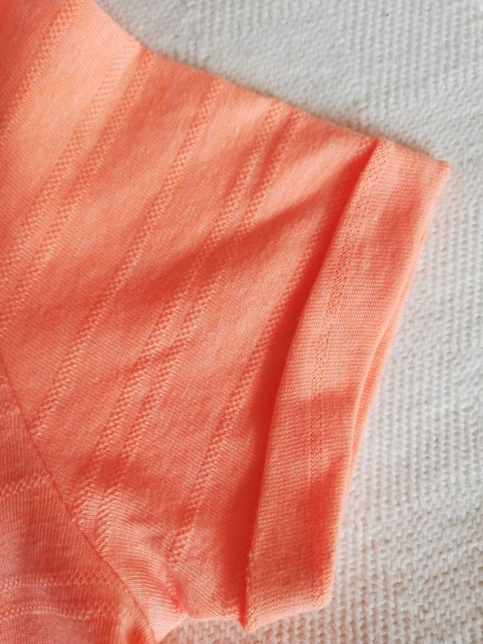 T-shirt orange en jersey orange (à rayures en point mousse), à manches courtes avec petits revers, taille 3 ans. En excellent état ("comme NEUF") : pas décousu, pas déchiré, pas tâché et très très peu porté.
