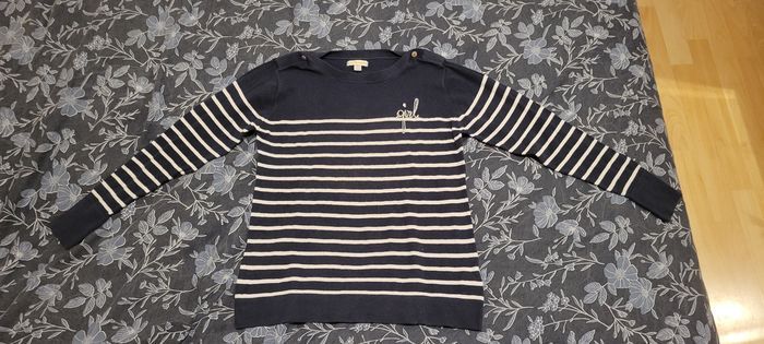 Pull bleu marine à rayures blanche. Il fais mis saison .
