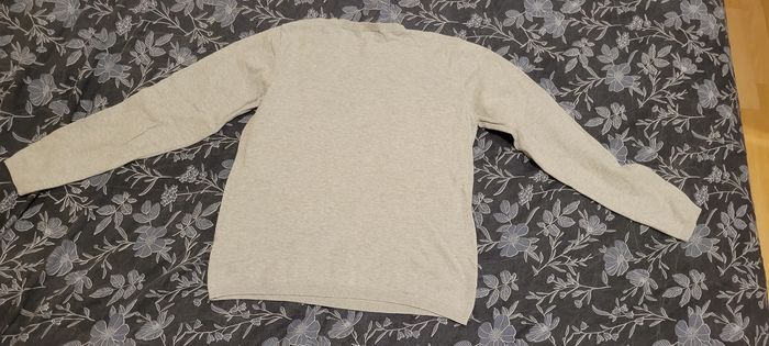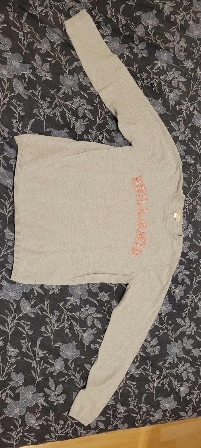Pull pas très epais qui fait mis saison gris avec une écriture.