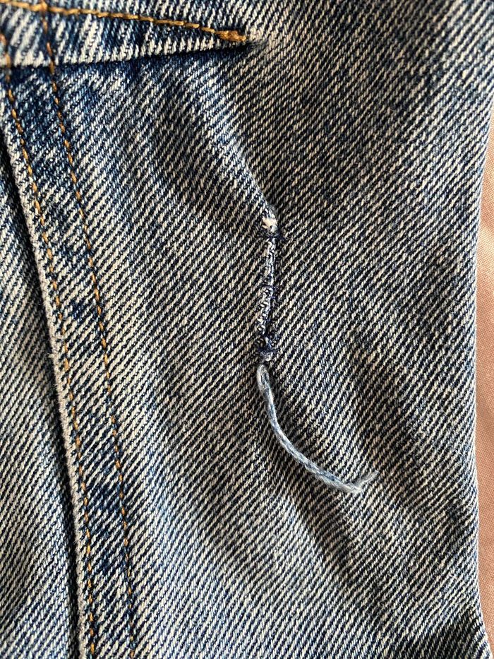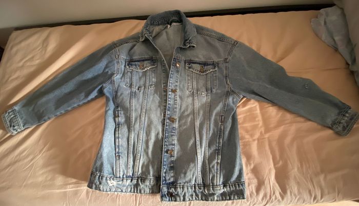 Veste en jean recousu sur une manche, taille S mais taille grand