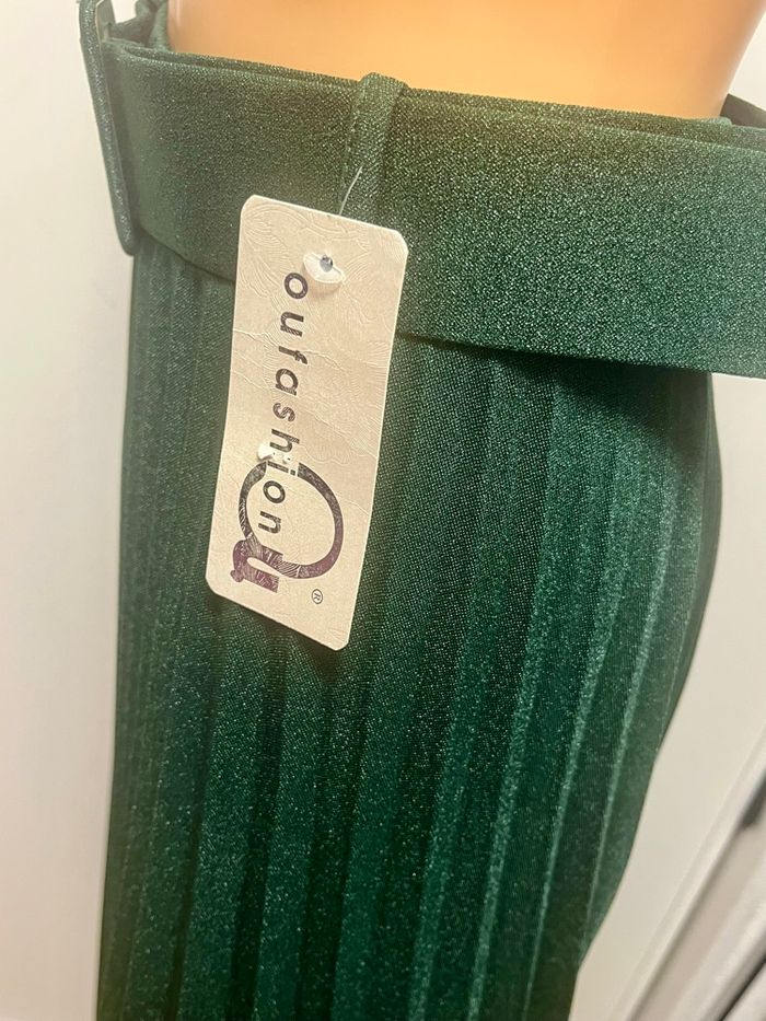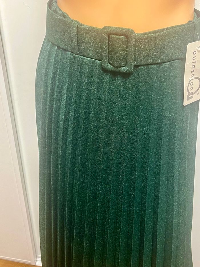 Jupe longue de couleur vert bouteille légèrement brillante avec sa ceinture Taille unique Marque fashion Neuve avec étiquette