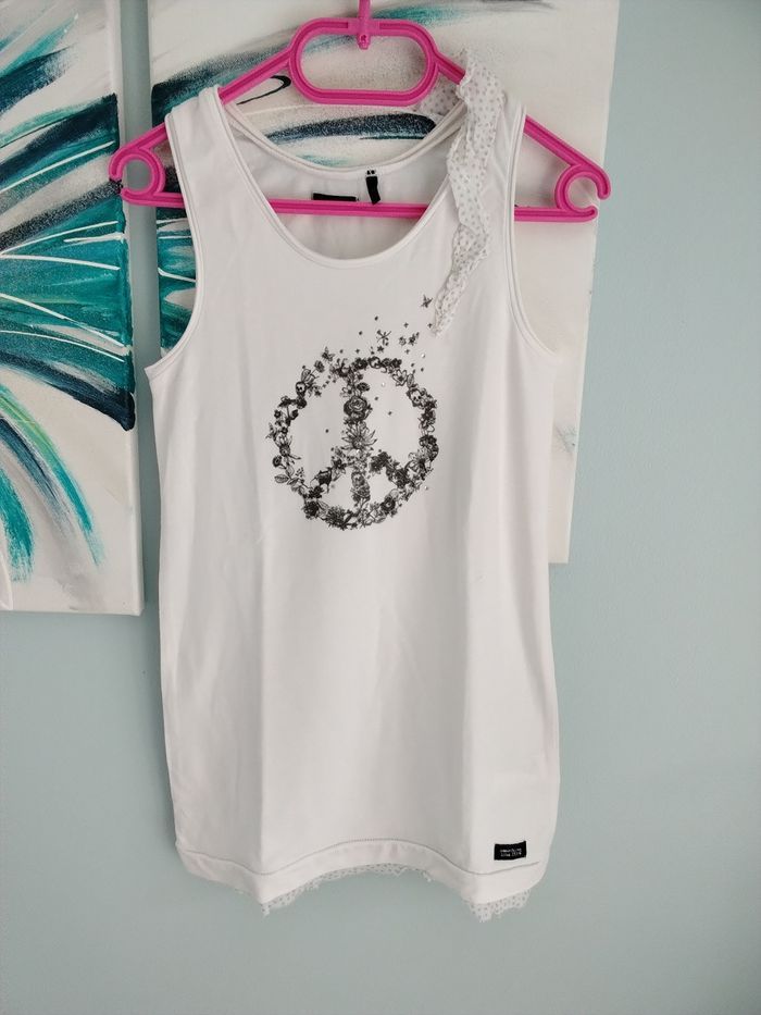 Robe blanche avec sigle peace and love en fleurs Photos et/ou renseignements supplémentaires sur simple demande D'autres articles disponibles dans cette taille dans mon dressing. N'hésitez pas à créer un lot ou me demander d'en créer un personnalisé pour vous 😉 Maison non-fumeur et sans animaux #melissarnaud #melissarnaudfille8ans #melissarnaudvetement #melissarnaudvetementfille