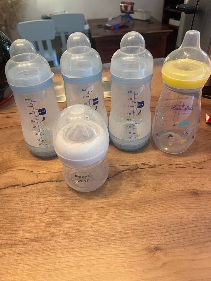 Lot de biberons : - 3 biberons MAM de 260 ml - 1 biberon LUC & LÉA de 270 ml - 1 biberon PHILIPPS AVENT de 125 ml (le seul à être vendue avec sa tétine, car n’a jamais servie)