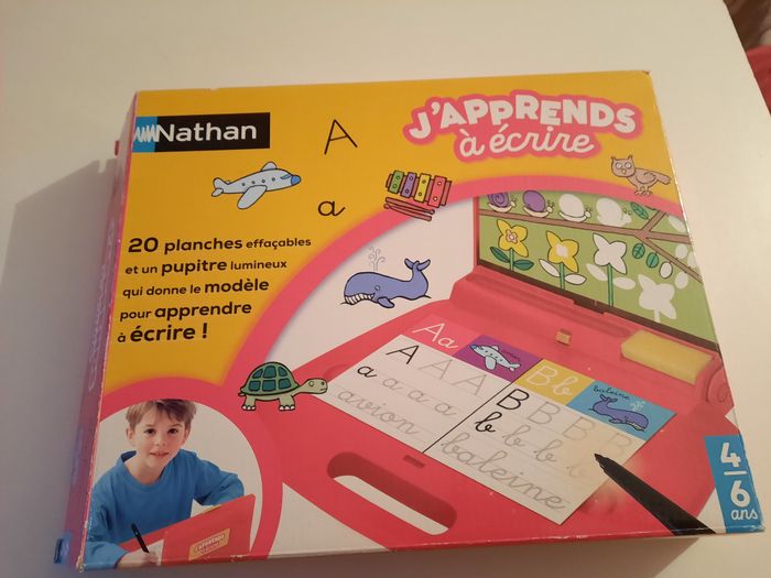 Je vends le jeu éducatif "J'apprends à écrire" de Nathan, parfait pour initier les enfants à l'écriture de manière ludique et progressive. - Type de produit : Jeu éducatif - Marque : Nathan - Âge recommandé : De 4 à 6 ans - Composition du lot : 20 planches effaçables, 1 pupitre lumineux avec modèles - Fonctionnalités : Pupitre lumineux qui guide l'apprentissage de l'écriture - Accessoires inclus : Stylet, gomme, boîte d'origine Bon état. Une marque de feutre est présente sur l'écran sans impact pour l'utilisation du jeu. Un excellent outil pour débuter l'apprentissage de l'écriture !