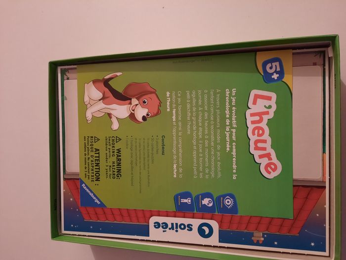 Je vends le jeu "L'heure" de Ravensburger, un jeu éducatif parfait pour apprendre à lire l'heure de manière ludique et progressive. - Type de produit : Jeu éducatif - Marque : Ravensburger - Nom du jeu : L'heure - Âge recommandé : À partir de 5 ans - Composition du lot : 1 horloge interactive, cartes illustrées, pièces de jeu - Fonctionnalités : Jeu évolutif avec plusieurs modes de jeu - Accessoires inclus : Boîte d'origine Très bon état. Un excellent jeu pour développer la compréhension du temps !