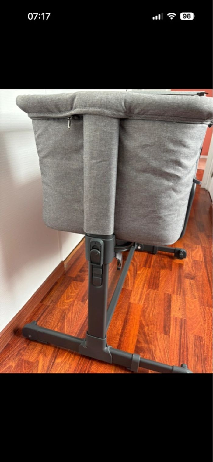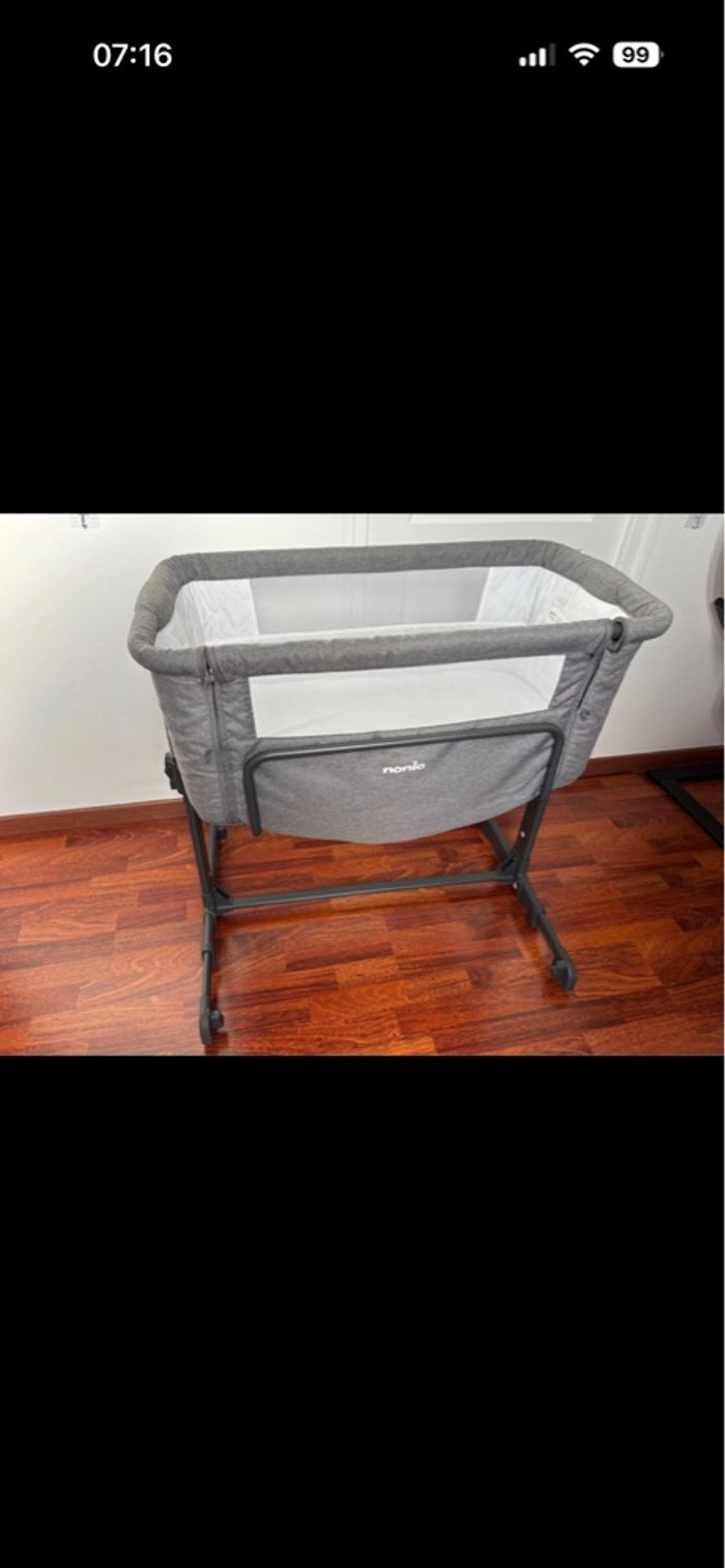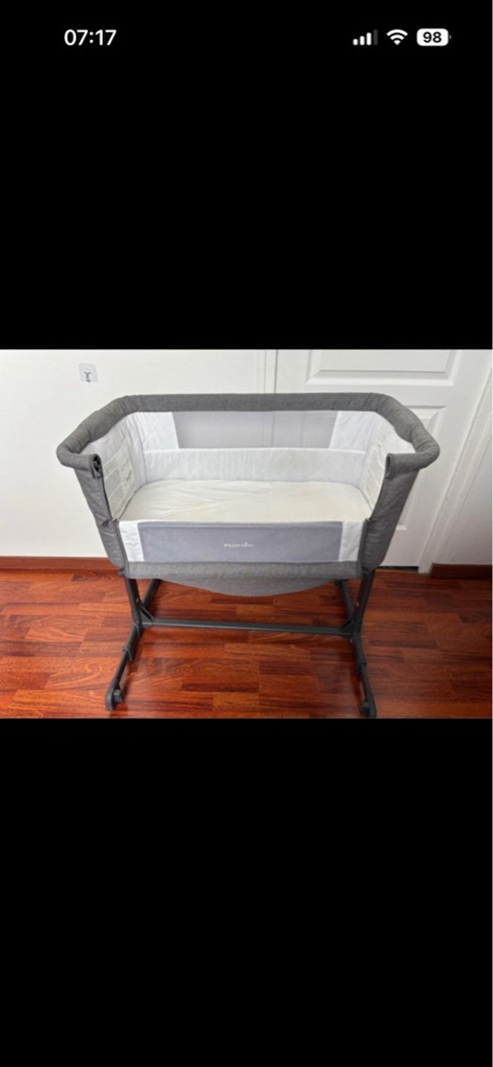 Cododo Nania. Réglable en hauteur ( peut se mettre en position inclinée pour les reflux ). Ouverture latérale. Démontable et attachable au sommier des parents. Lot de 2 draps avec. 60€. #cododo #nania #litbebe #litparapluie #litcododo