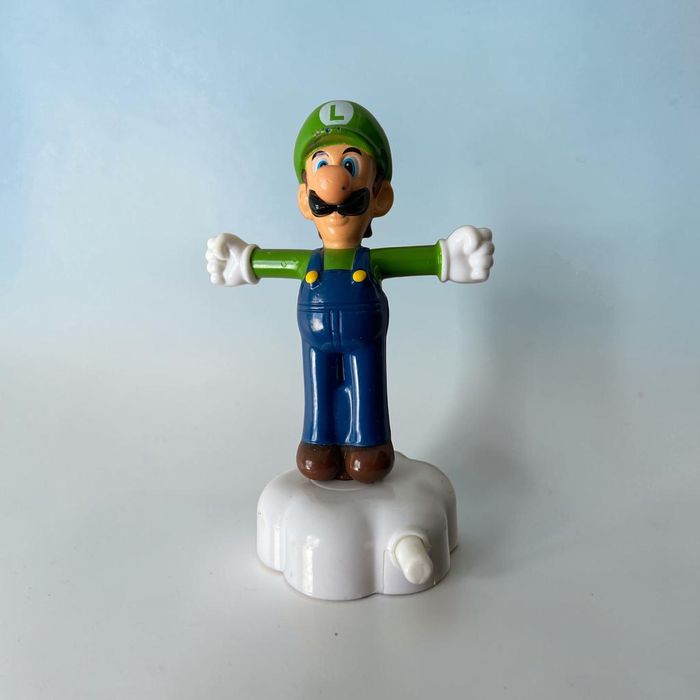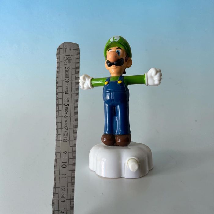 Vends figurine de Luigi (frère de Mario) en tenue classique, debout sur un socle en forme de nuage blanc. Il s'agit d'un jouet mécanique : une fois remonté grâce au bouton poussoir sur le côté, la figurine s'anime (mouvement de rotation/danse). Détails de l'article : Personnage : Luigi (Super Mario Bros). État : Bon état général. Présente quelques légères traces d'usage normales (voir photos pour les détails de la peinture sur le nez et la casquette). Dimensions : Environ 11 cm de hauteur totale (socle inclus). Fonctionnement : Mécanisme à remontoir fonctionnel. Idéal pour : Collectionneurs de l'univers Nintendo / Mario Kart. Décoration de chambre d'enfant ou étagère de gaming. Cadeau pour un fan de rétro-gaming.