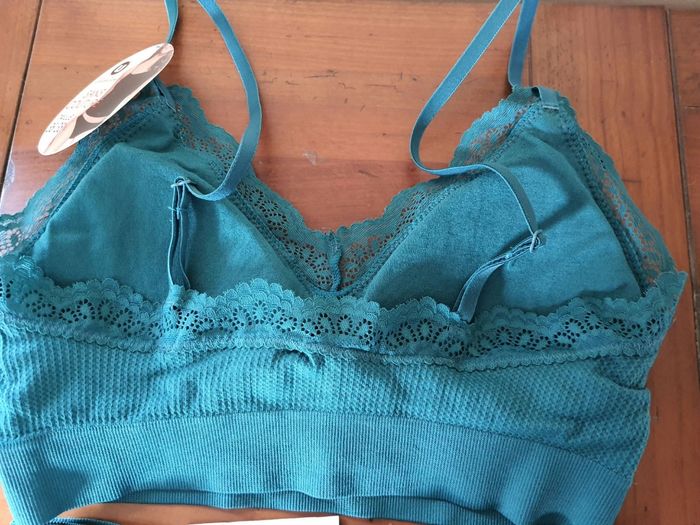 Lot NON PORTE, NON utilisé et étiqueté 1 brassière 93% polyamide 7% élasthanne, doublure coque amovible 100% polyester 2 slips même matière Taille 36/38 l ensemble Couleur vert Voire photos pour détails