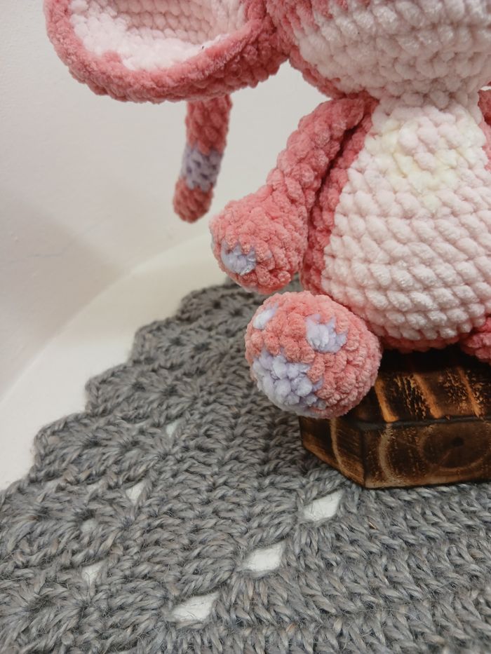 Angel fait au crochet en fil chenille, fushia, rose clair, blanc et violet, ses yeux sont en feutrine, son nez est brodés