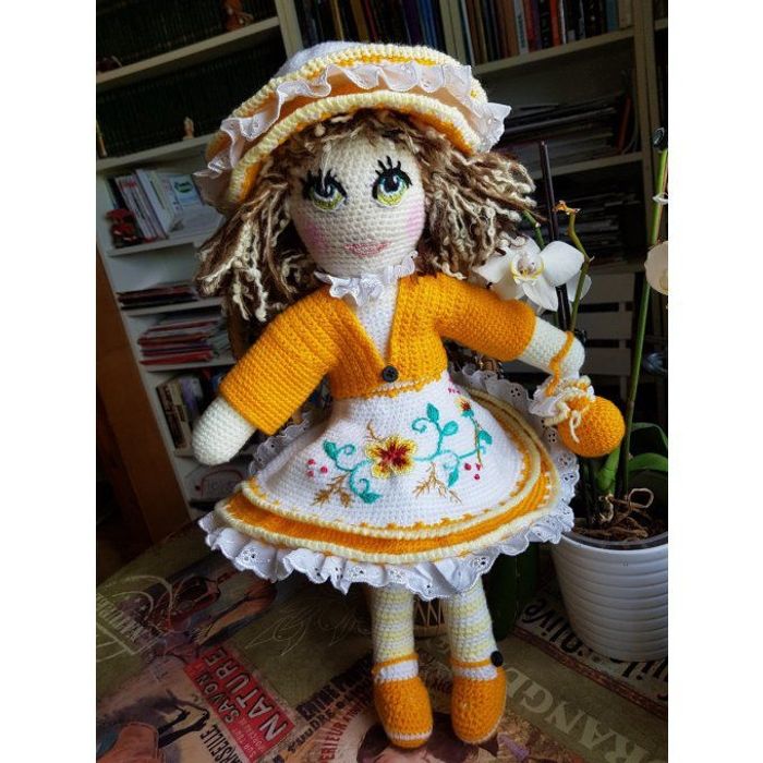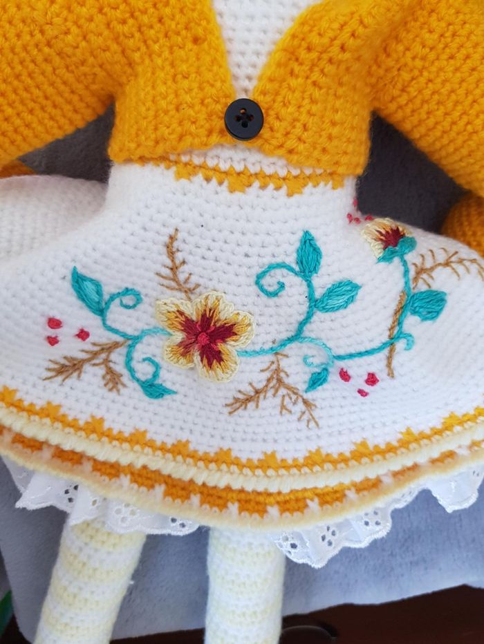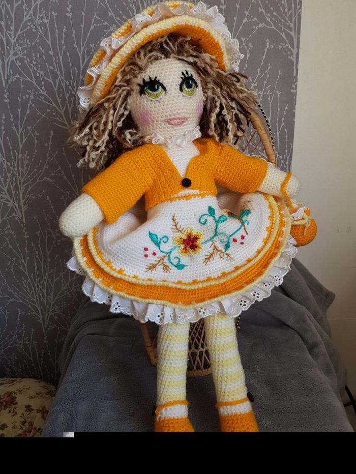 Jolies poupée Faite Main. Rembourrage hypoallergenique. 45cm Aucun ajout dangereux, yeux, bouche...etc. Tout est brodé, pour la sécurité des petits. Jupe,( avec bord en broderie anglaise) et chapeau brodés Main. Petit pantalon avec bord dentelle. Beau cadeau à faire à une petite fille.
