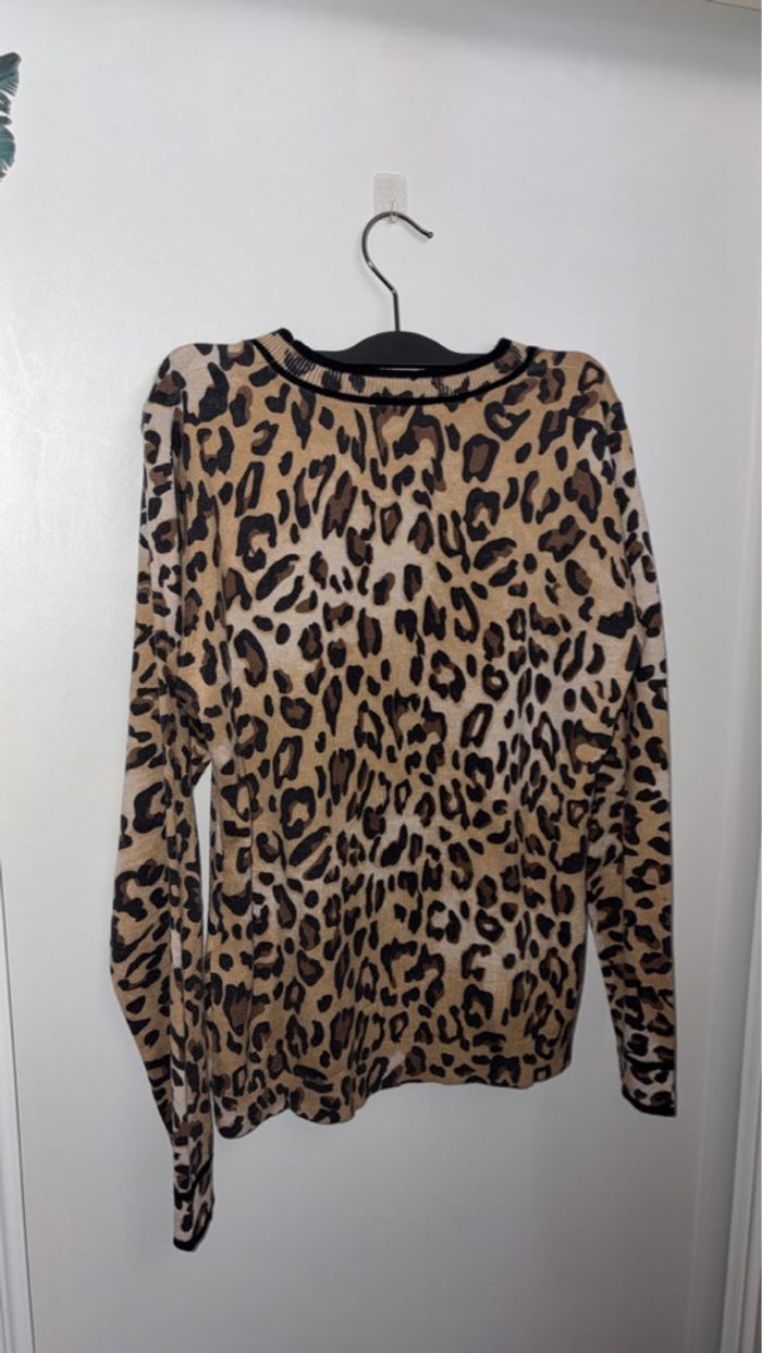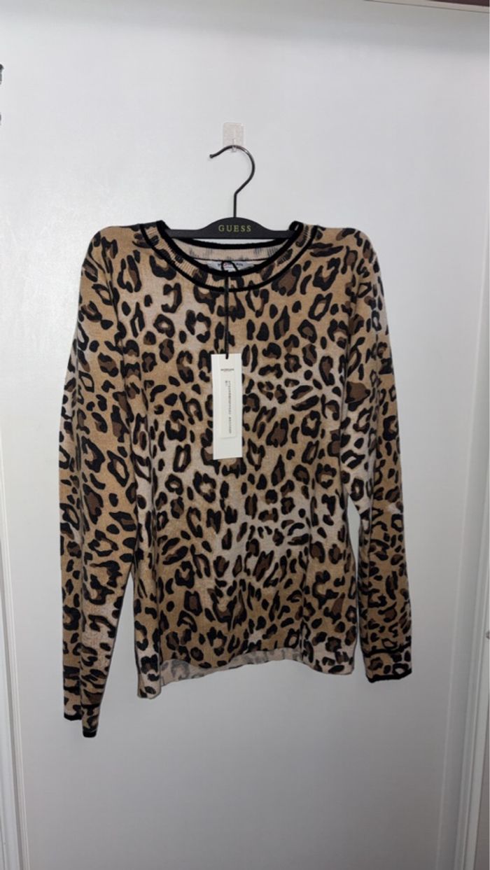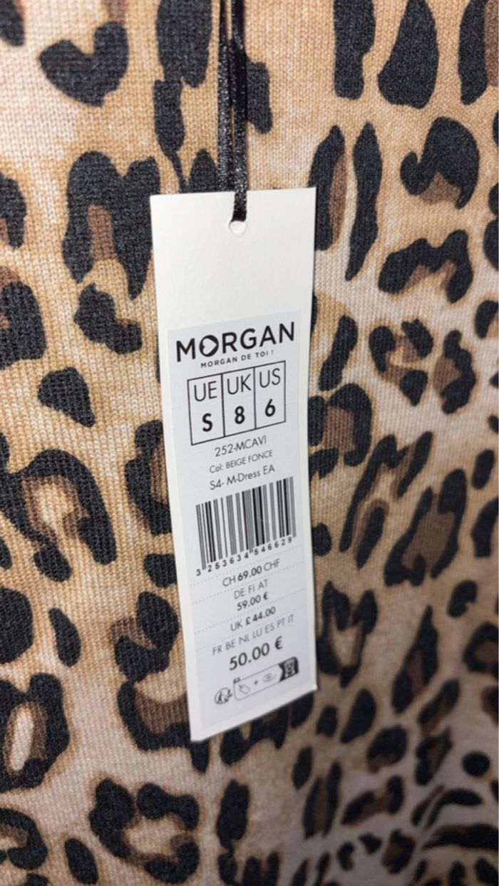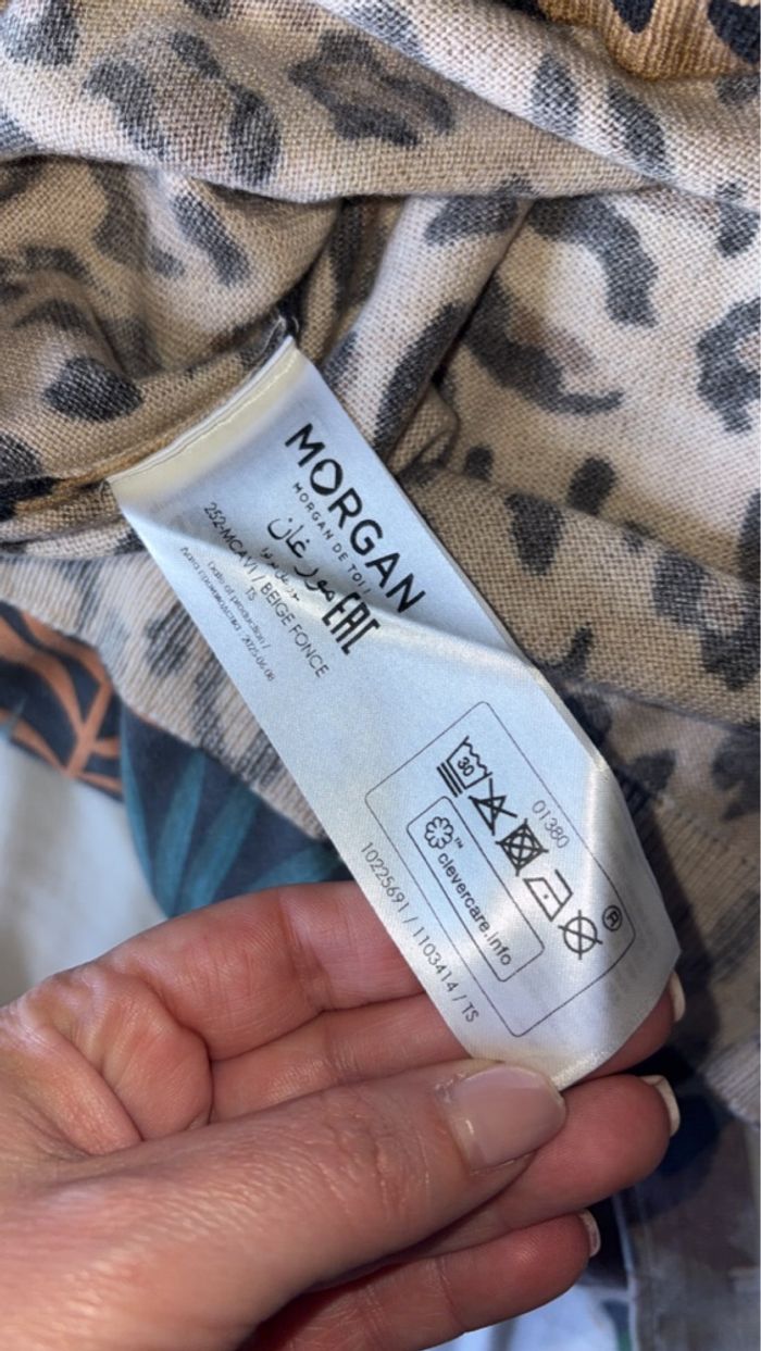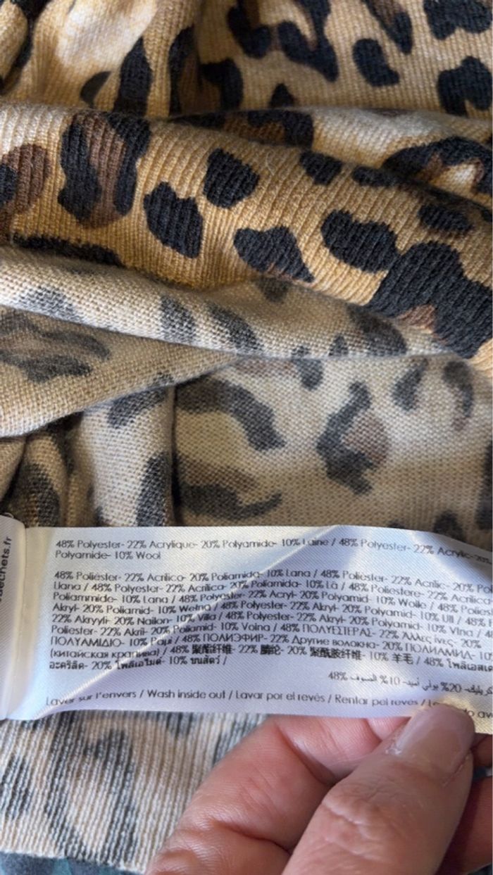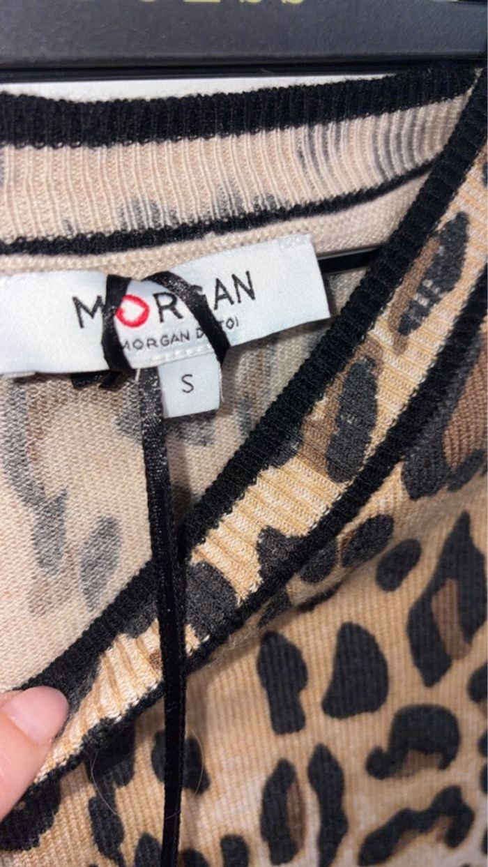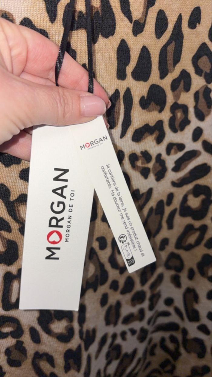 Je vends ce magnifique **pull à imprimé léopard** de la marque **Morgan**, acheté il y a quelques mois. * **Pourquoi je m'en sépare :** Je fais un grand tri dans mon dressing et je ne l'ai finalement jamais porté. * **État :** **Neuf avec étiquette**. Il n'a jamais été utilisé et est dans un état impeccable, comme en magasin. * **Coupe/Taille :** Taille S (correspond à un 36 FR / 8 UK / 6 US). La coupe est ajustée et la maille contient 10% de laine pour plus de douceur et de chaleur.
