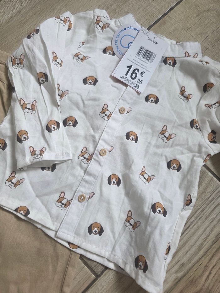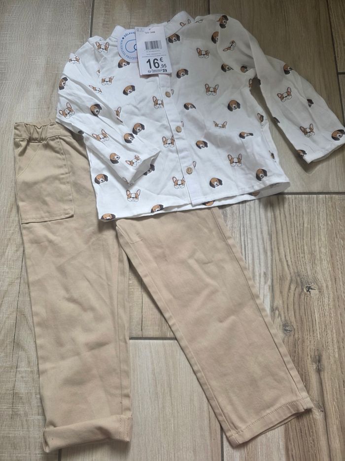 Ensemble pantalon + chemise. Neuf avec étiquette. Jalais porté. 36 mois Pantalon réglable a l'intérieur.