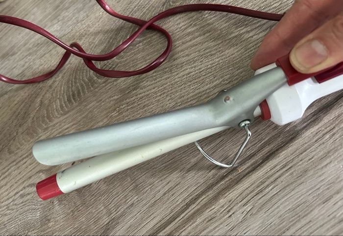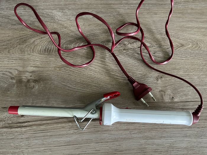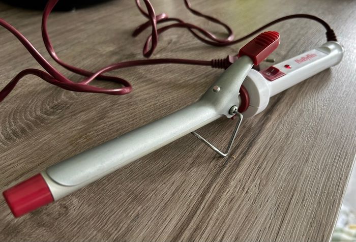 Fer à boucler les cheveux marque BaByliss avec interrupteur, revêtement satin, embout isolant et béquille pour poser. Longueur 14cm. Fonctionne parfaitement.