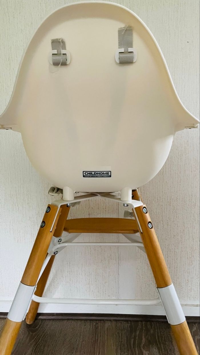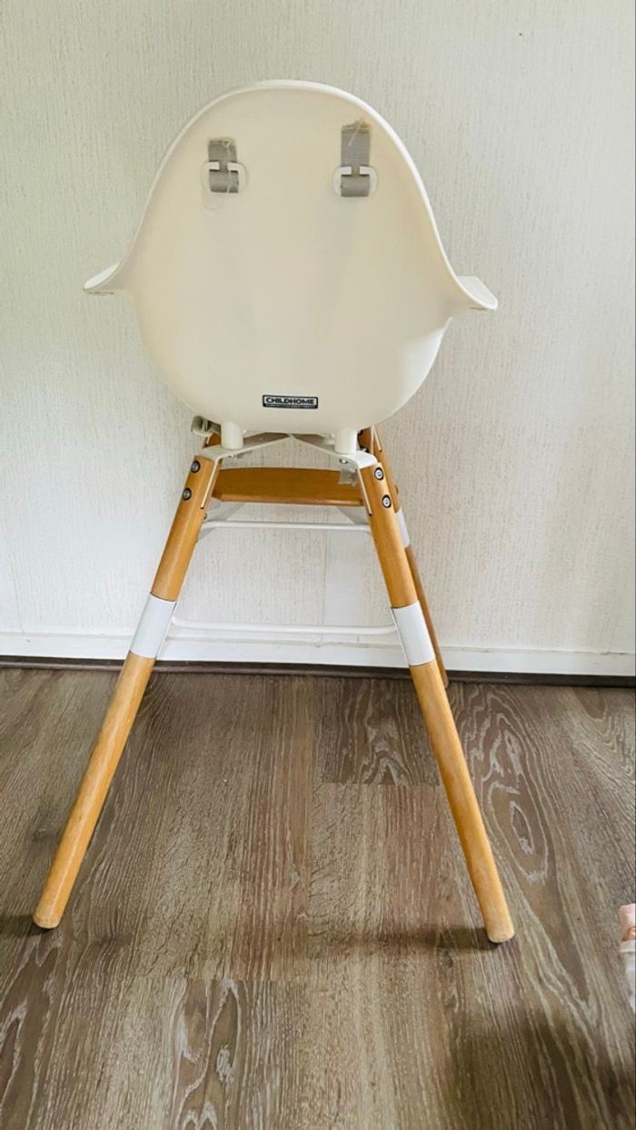 Chaise haute en bois marque combelle avec coussin et plateau