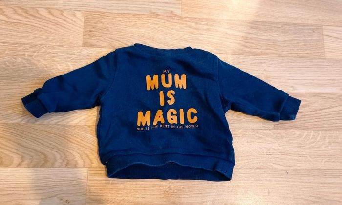 Pull bleu marine avec écriture jaune et 3 boutons pression dans le dos 😁 Pour plus d'articles vous pouvez cliquer sur mon profil 🤓