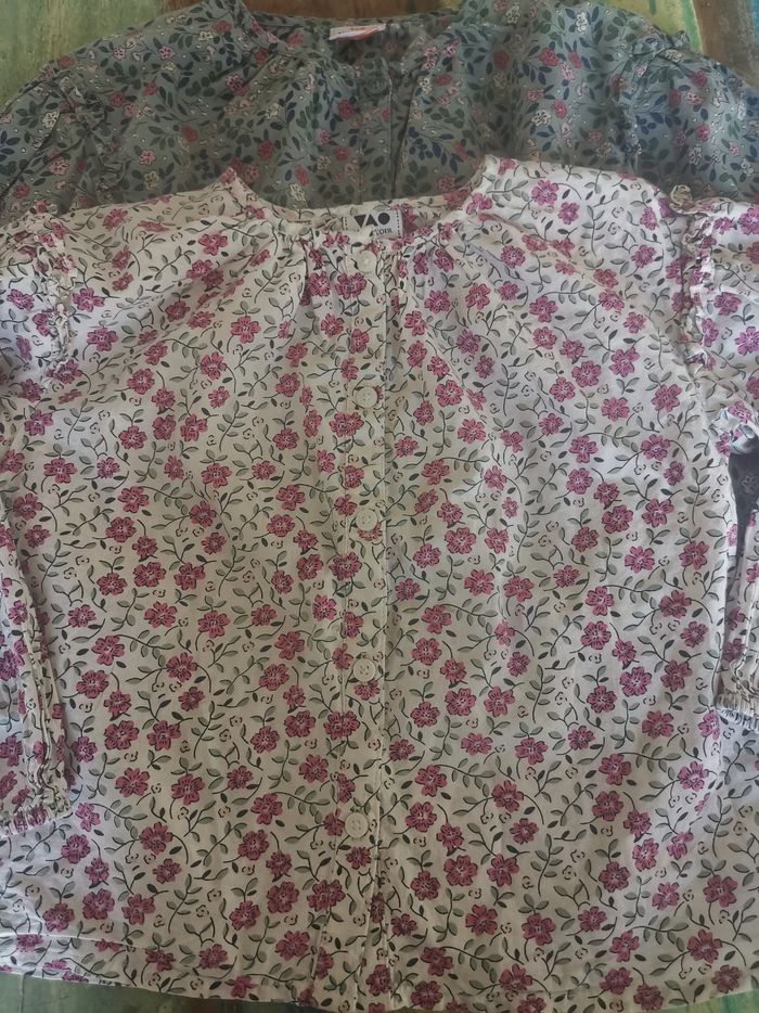 Lot de 2 blouses, en très bon état. La blouse écrue a 2 petites tâches qui ne ne voient pas car elle se fondent dans les motifs. (voir dernière photo)