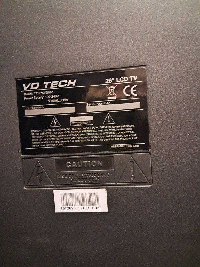 Télé lcd 26 pouce 66cm diagonale VD TECH sans télécommande mais s'allume sur le côté de la télé
