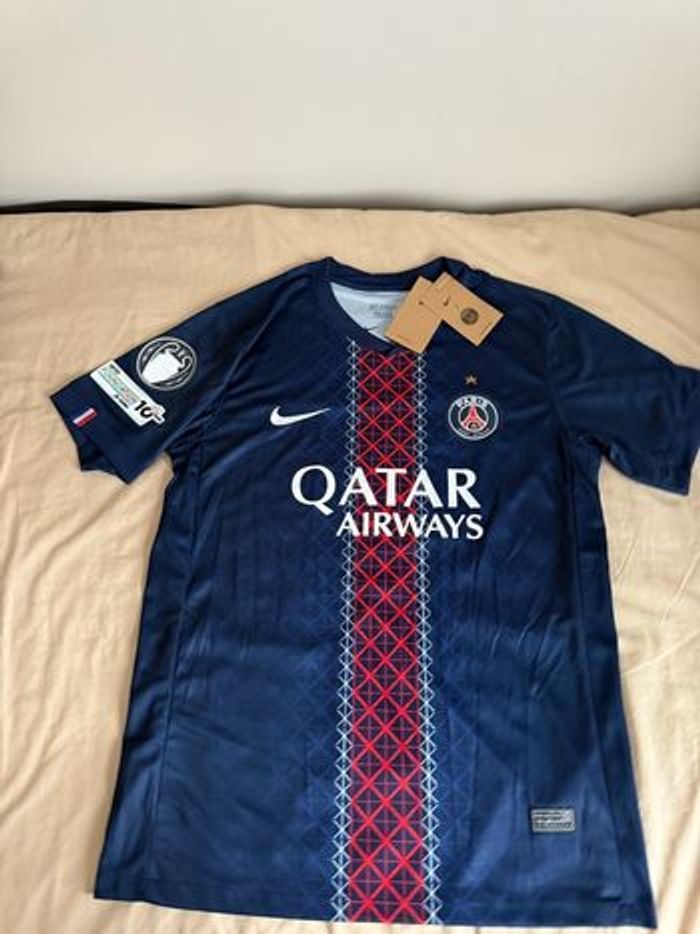 Maillot PSG 2025/2026 Khvicha Kvaratskhelia Badge UEFA Taille M Maillot PSG 2025/2026 – Domicile ⭐ Flocage Khvicha Kvaratskhelia n°7 ⭐ Badge Ligue des Champions + UEFA Foundation 10 ans ⭐ Étoile LDC floquée 📦 Jamais porté, encore sous emballage 📌 Taille : M 📌 Saison : 2025/2026